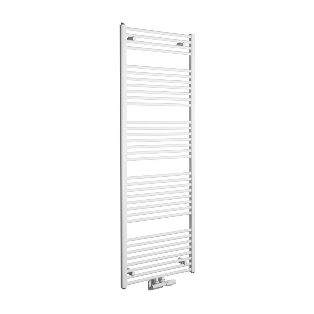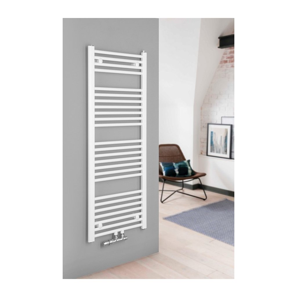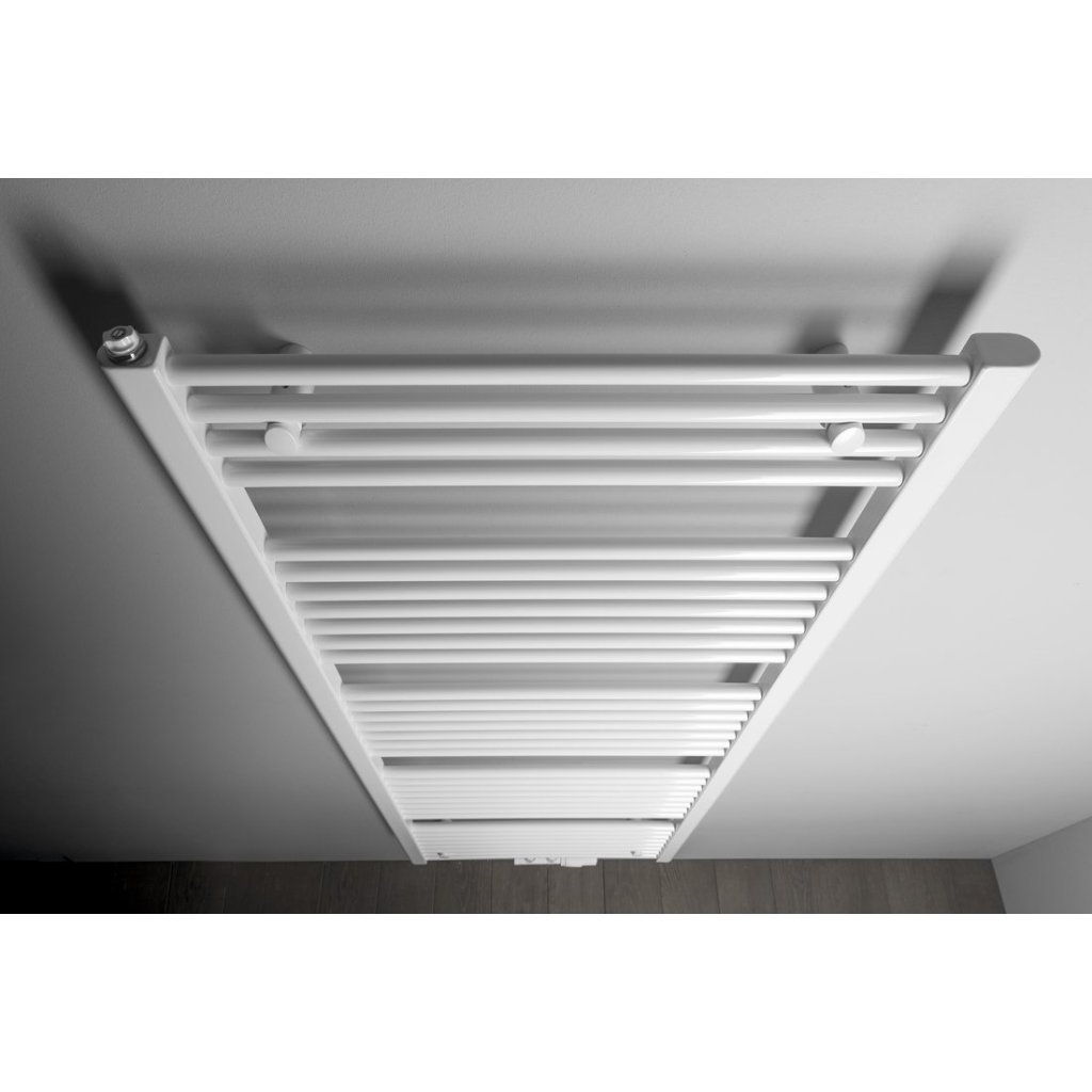 Hagyományos formájú acélcsövekből készült fűtőelem fehér kivitelben, egyenes vízszintes profilokkal, központi csatlakozással 50 mm-es osztásközzel.