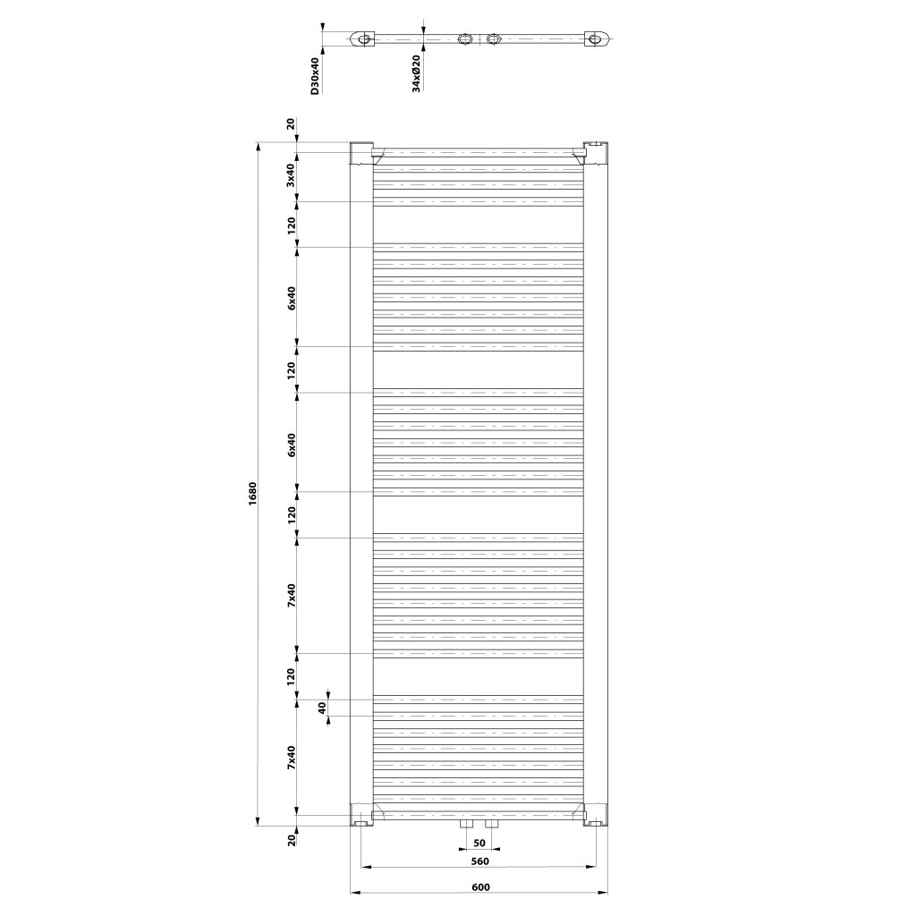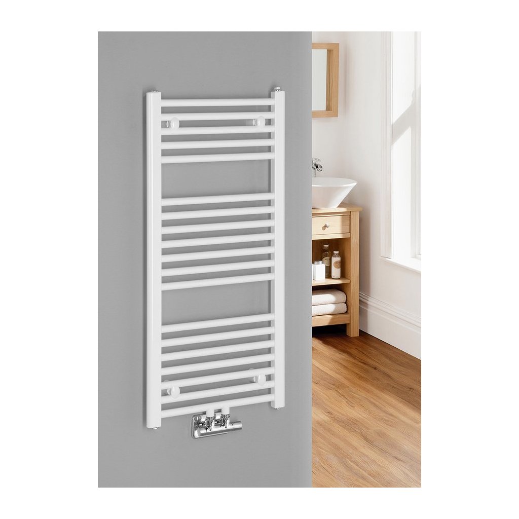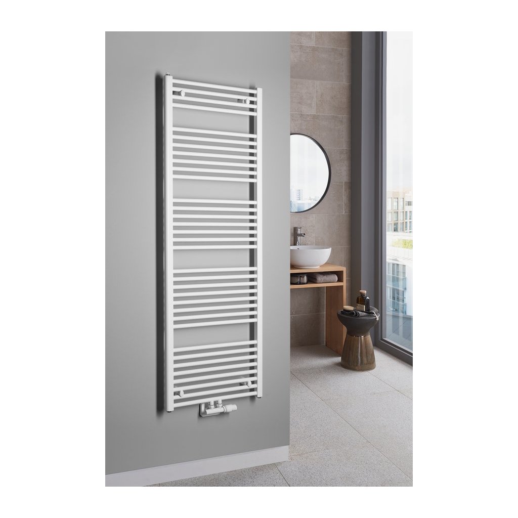 Hagyományos formájú acélcsövekből készült fűtőelem fehér kivitelben, egyenes vízszintes profilokkal, központi csatlakozással 50 mm-es osztásközzel.