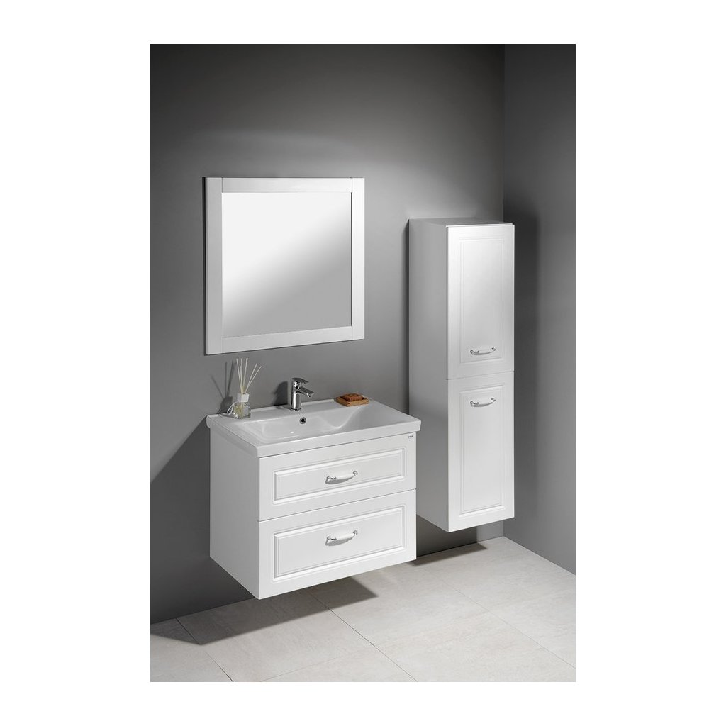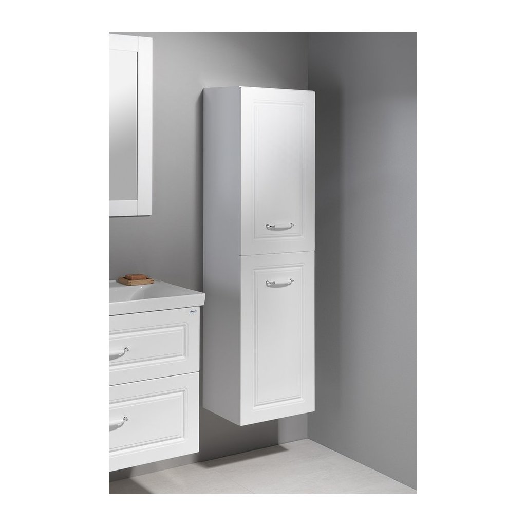 - A szekrény elegáns fogantyúkkal rendelkezik, fehér-króm kivitelben.