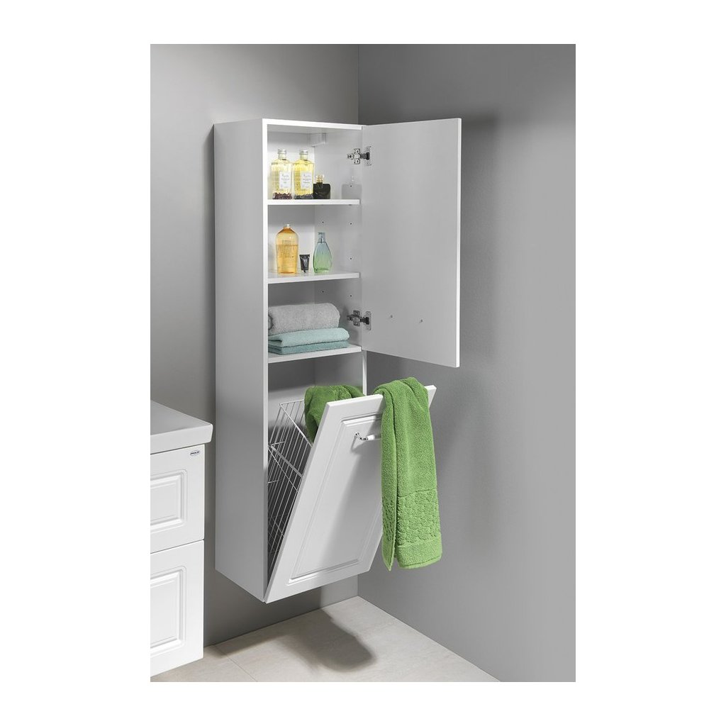 Függesztett magas szekrény, szennyeskosárral