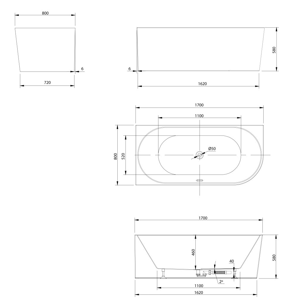 A kád tartalmaz egy túlfolyó készletet, egy csattanós dugós lefolyót és egy szifont