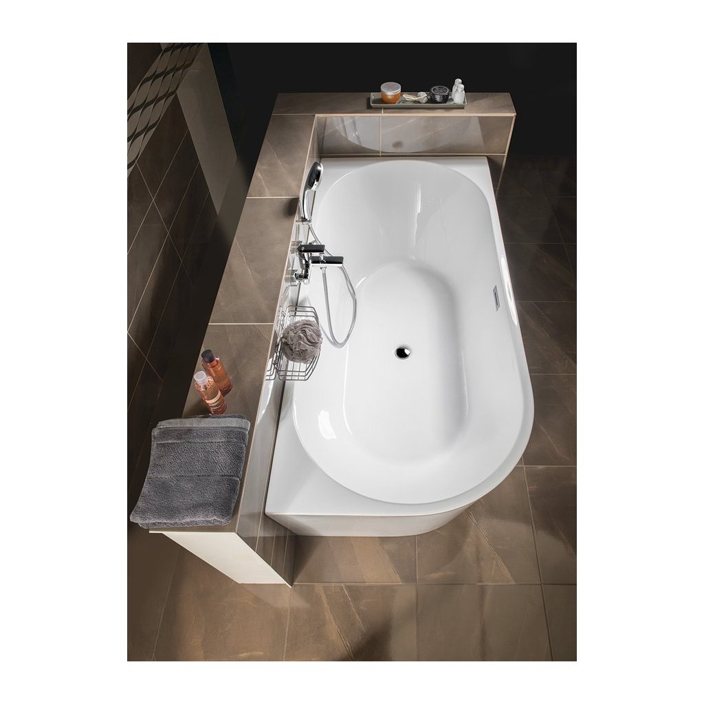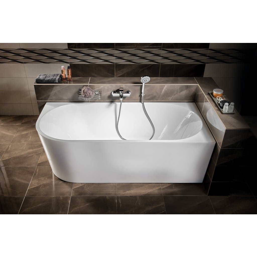 A szabadon álló TIBERA fürdőkád nincs falazva vagy csempézett. Kialakítása sarokba szerelhető, így érdekes alternatívája a klasszikus sarokkádnak. A hátsó oldala is látható, így még a térben is elegánsan fog kinézni. Érdemes odafigyelni a túlfolyó téglalap alakú, rozsdamentes burkolatú rés alakú megoldására.