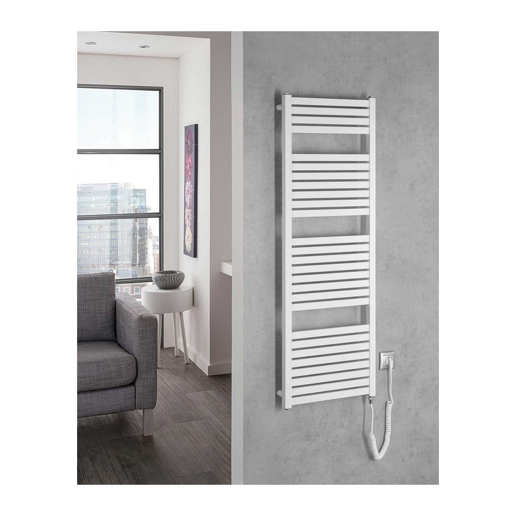Elektromos fűtőtestek négyzet alakú csövekkel. Az elektromos fűtőtestek fürdőszobákban, folyosókban vagy WC-kben való elhelyezésre alkalmasak. Elektromos fűtőrúddal vannak felszerelve, kábellel és dugóval a konnektorba.