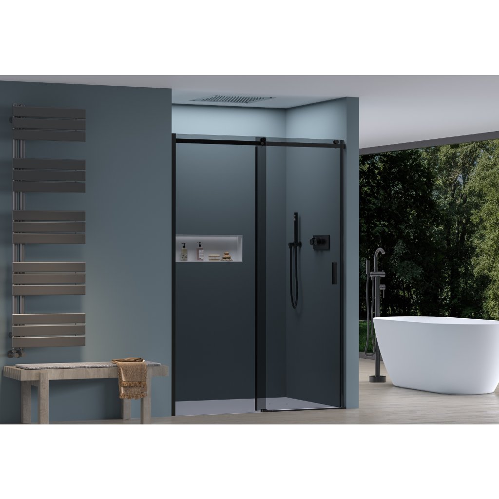 Az ajtó ideális fülkében történő beépítéshez, ami jelentősen megtakarítja a helyet még kisebb fürdőszobákban is. A beépítés univerzális, így az ajtó jobb vagy bal oldalra is beépíthető egyedi igények szerint. A profil fekete színű alumíniumból készült. Az alumínium egy olyan anyag, amely nagyon ellenáll a mechanikai sérüléseknek és a nedvességnek a fürdőszobában. Az ajtó fekete fogantyúval rendelkezik a könnyű nyitás érdekében. Mindig ügyelni kell a helyes mérésre és beépítésre, hogy az ajtó stabilitása a lehető legmagasabb legyen.