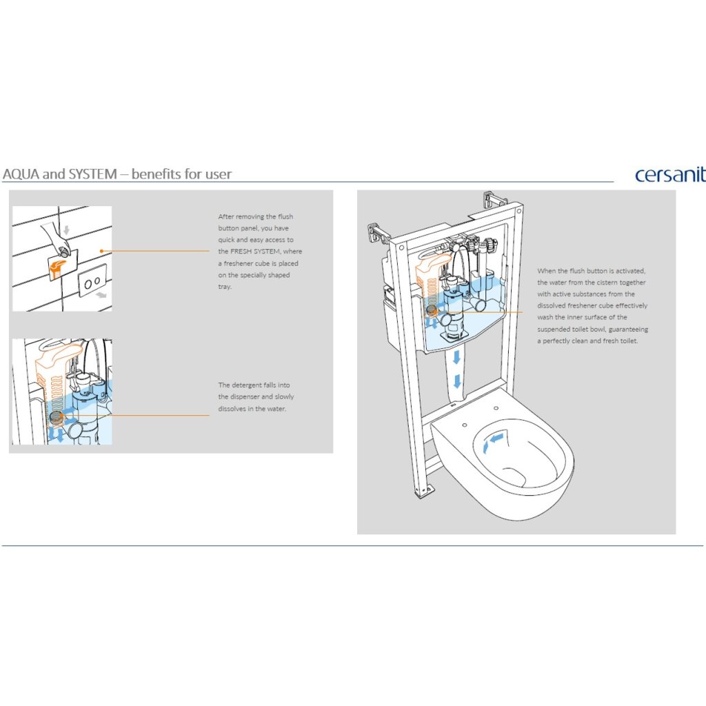 A FRESH SYSTEM megoldással ellátott rejtett keret speciális, a frissítőkockákhoz igazított kosárral van felszerelve. Ez egy komplett, korszerű megoldás, amely garantálja az átfogó WC-higiéniát.