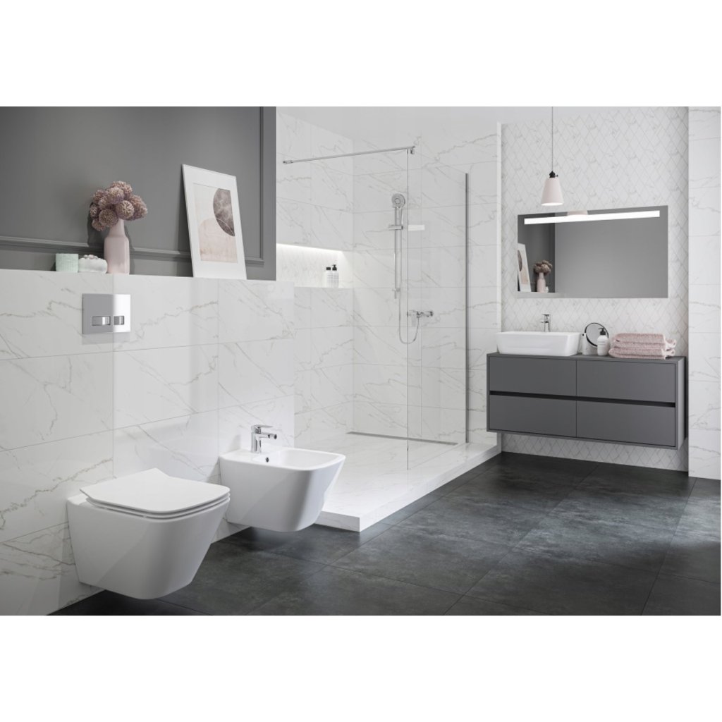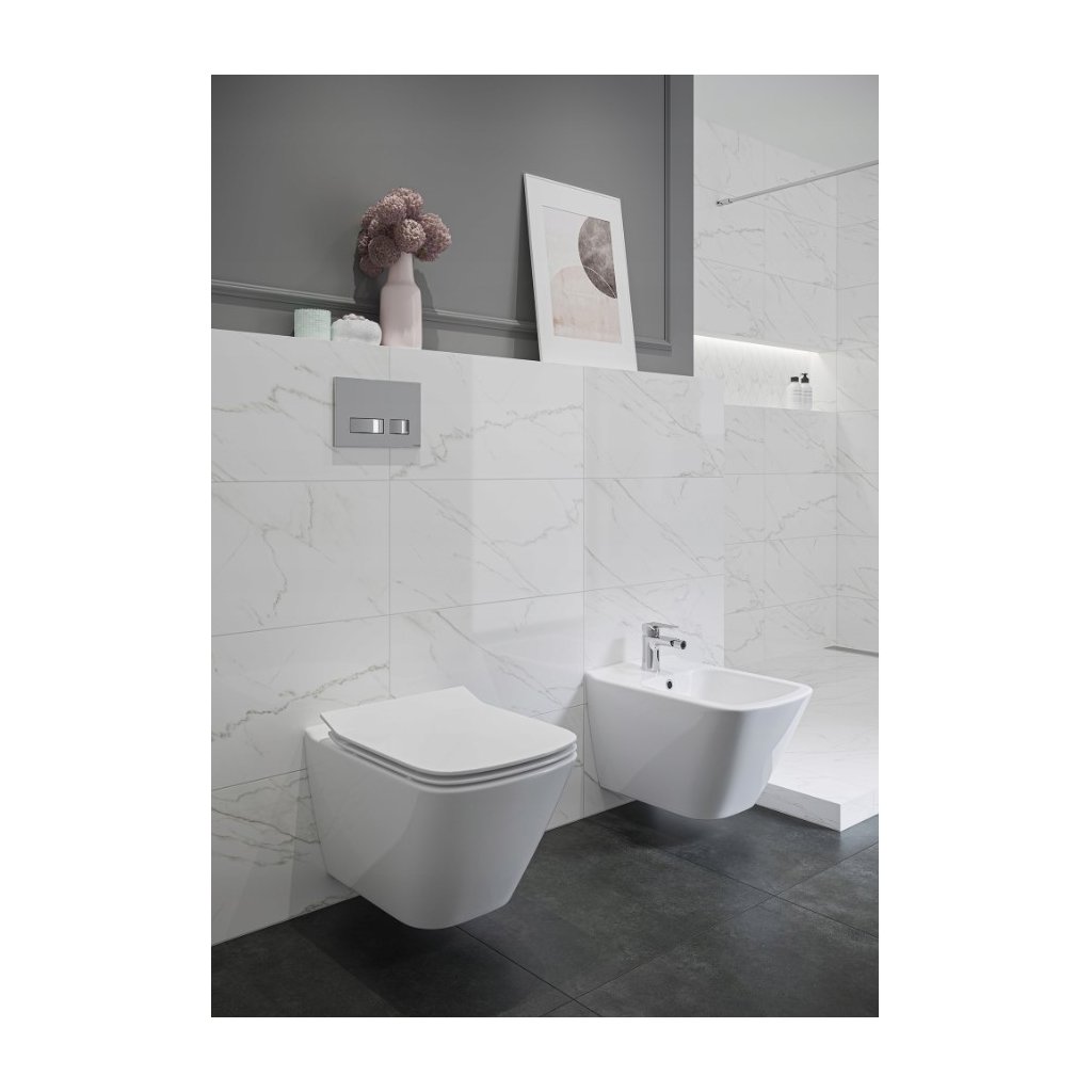 A City Square K35-041 akasztós tál rejtett rögzítési rendszerrel rendelkezik, amely javítja az esztétikát és leegyszerűsíti a telepítést. Innovatív CleanOn technológiával van felszerelve, amely biztosítja a higiéniát és a használat biztonságát. Ennek köszönhetően öblítéskor a víz alaposan átmossa a kerámia teljes belső felületét, tisztán és frissen hagyja azt. A nyakörv hiánya azt is jelenti, hogy nincs hely, ahol a baktériumok és a baktériumok felhalmozódjanak. A tál alkalmas 2/4 l, 2,5 / 5 l vagy 3/5 l gazdaságos öblítésére, amivel vizet takarít meg. A Virgo / City Square K980220 tábla kiváló minőségű hőre keményedő anyagból készült. A kényelmes használatot az egyszerűsített forma biztosítja, amely lehetővé teszi a test optimális elhelyezését ülő helyzetben. Az egyszerű leválasztás megkönnyíti a tisztítást, a szabadesés funkció pedig megakadályozza a kerámia ütközését.