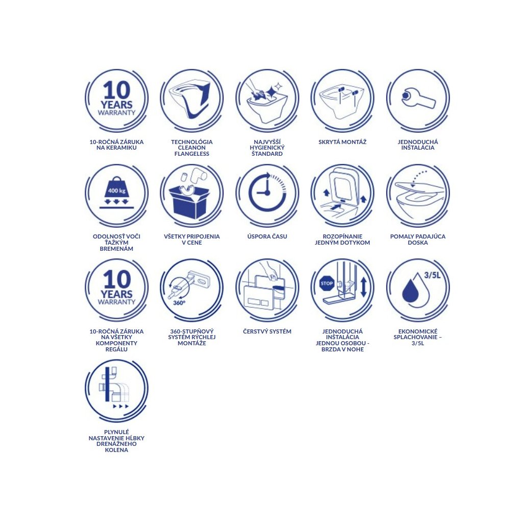 LARGA SQUARE akasztótál innovatív CleanOn technológiával. Ennek a technológiának köszönhetően a víz hatékonyan mossa le a tál összes belső felületét, és a WC hosszabb ideig tisztább és higiénikusabb marad. A LARGA szerelhető tálat modern kialakítása különbözteti meg egymástól. A készlet tartalmaz egy szupervékony SLIM WRAP táblát, melynek egyszerű felépítése biztosítja a könnyű tisztítást, az innovatív egygombos easyoff megoldás pedig a tábla gyors és egyszerű eltávolítását teszi lehetővé egy gombbal. A szabadesés funkció biztosítja a tányér fokozatos leengedését, és megakadályozza, hogy hirtelen a tálhoz ütődjön.