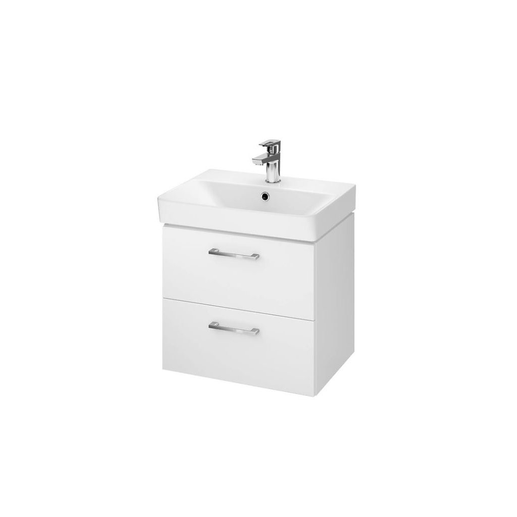A fényes kivitelű, két fiókos, lágyan záródó akasztós szekrényt króm fogantyúk egészítik ki, kerámia mosdóval együtt.