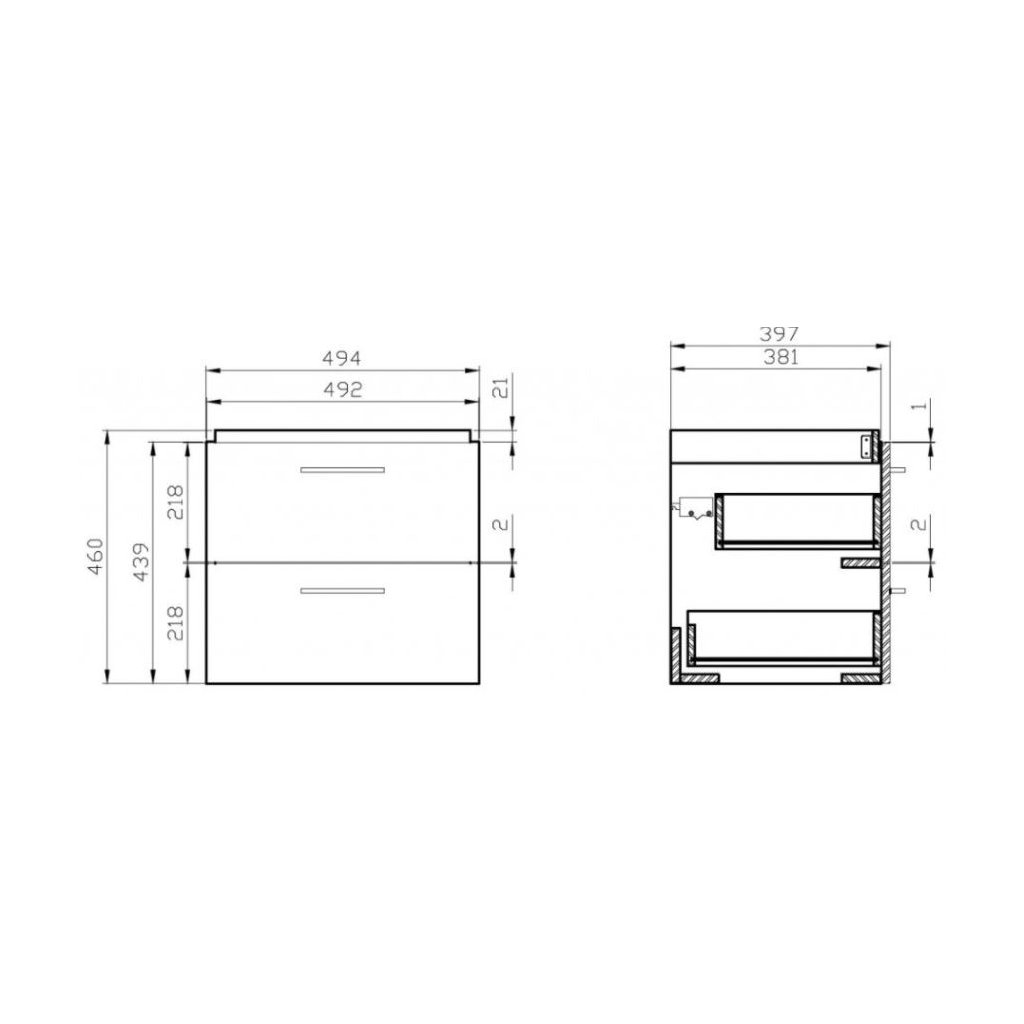 A fényes kivitelű, két fiókos, lágyan záródó akasztós szekrényt króm fogantyúk egészítik ki, kerámia mosdóval együtt.