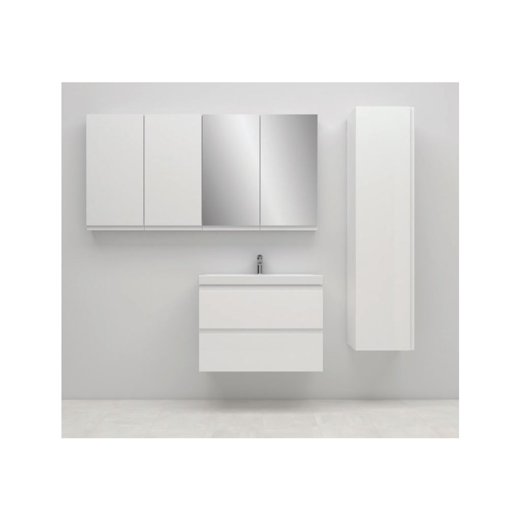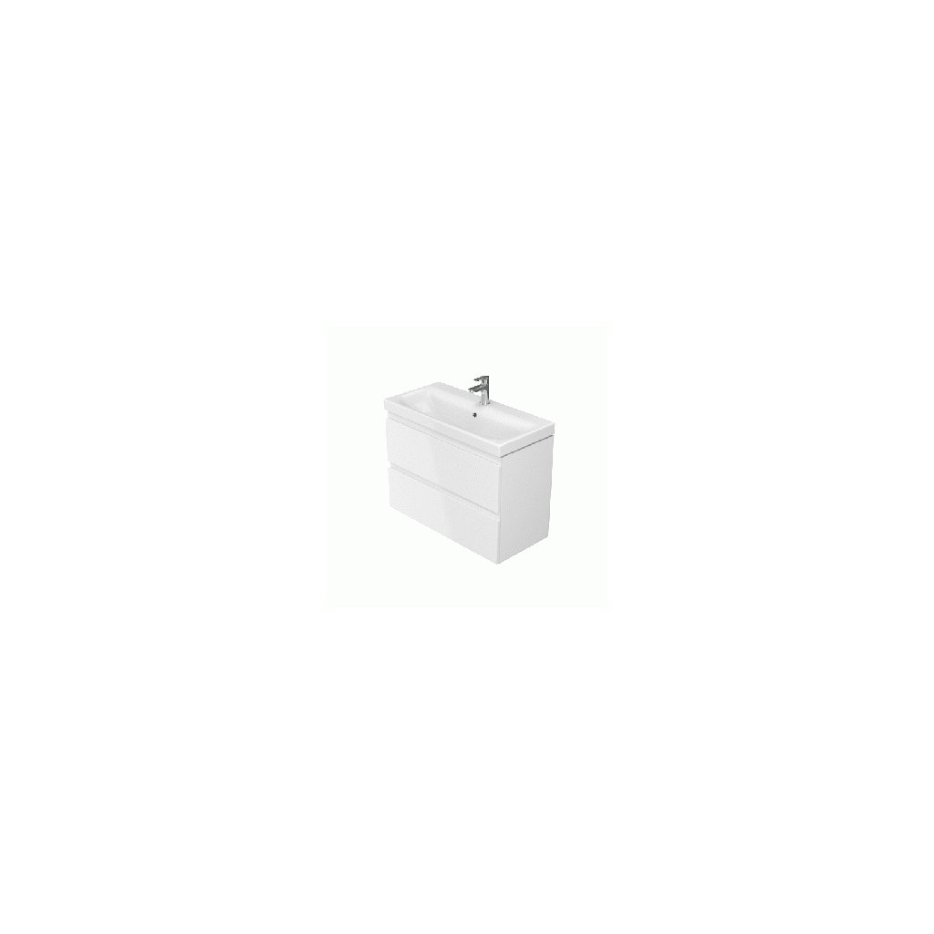 A MODUO SLIM kollekció kisebb mélységű, mint a standard mosdókészlet, és a modern fürdőszobabútorok egyik példája. A rejtett fogantyús fiókok elülső részeit és a szekrénytestet fényes fehér lakk borítja, a mosdókagylón túlfolyó és egy lyuk a csap számára. A fiókok csendes záródású rendszerrel vannak felszerelve.
