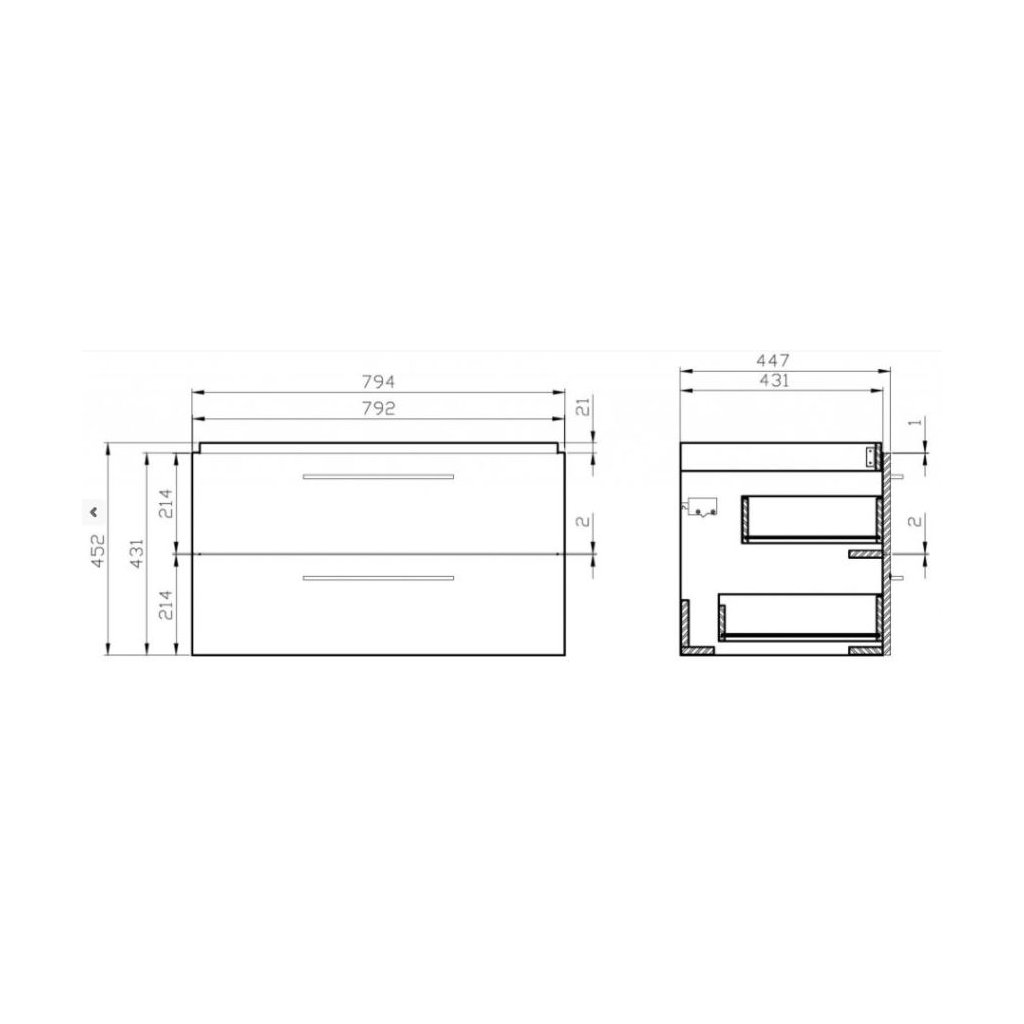 A fényes kivitelű, két fiókos, lágyan záródó akasztós szekrényt króm fogantyúk egészítik ki, kerámia mosdóval együtt.