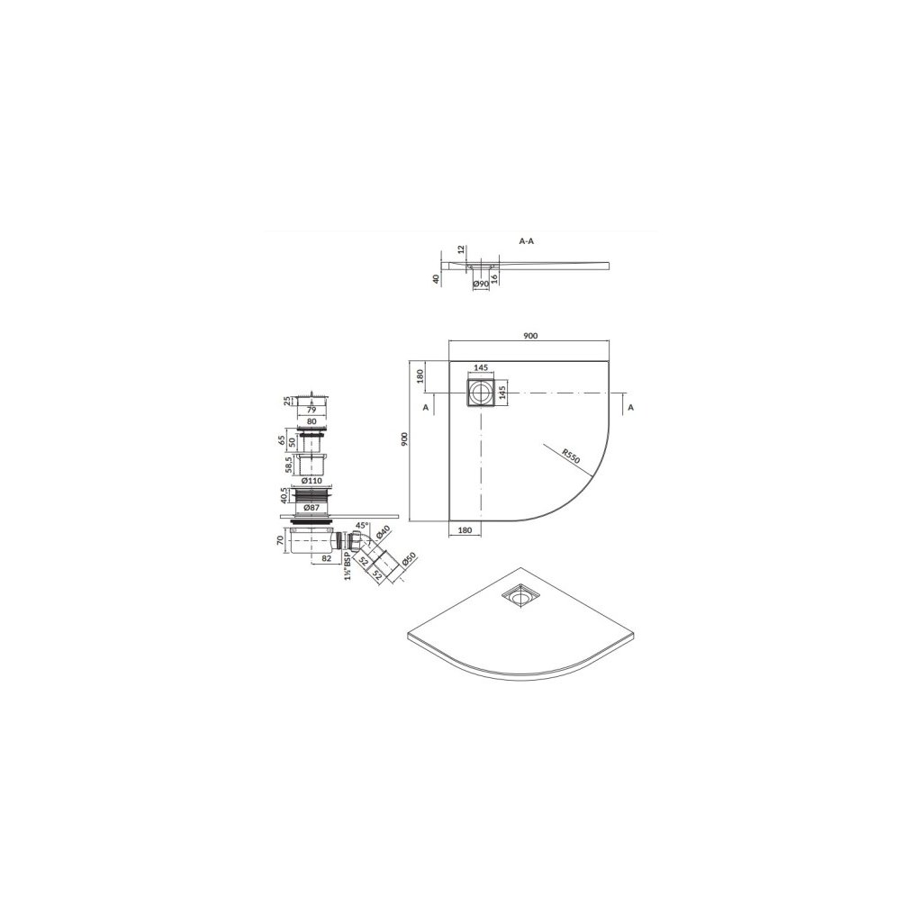- Típus: Negyedkör alakú zuhanytálca