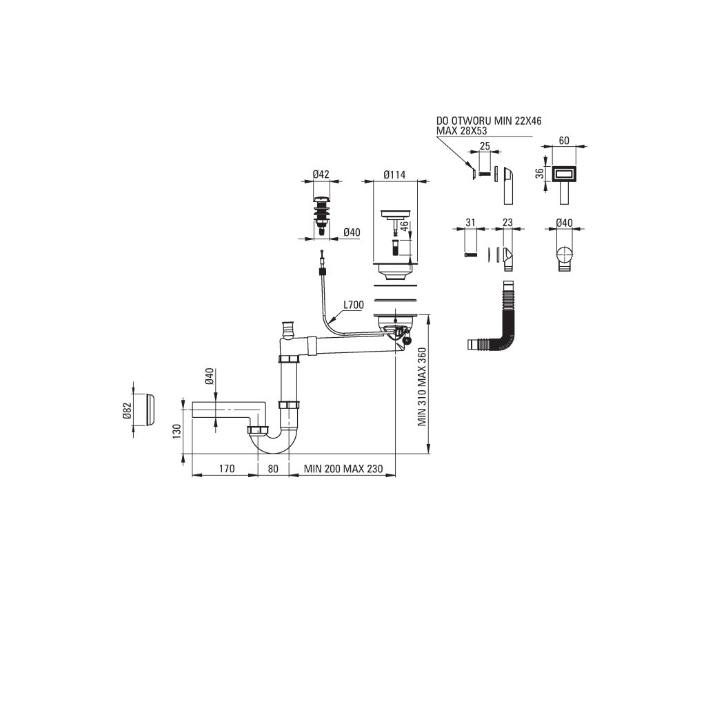 A szifon beépített gránit mosogatóhoz való, 1 kamrás. A készlet tartalmaz egy automatikus dugót és kétféle áramlást: kerek és téglalap alakú. Ez egy helytakarékos modell, amely kialakításának köszönhetően sok helyet takarít meg a szekrény alatt.