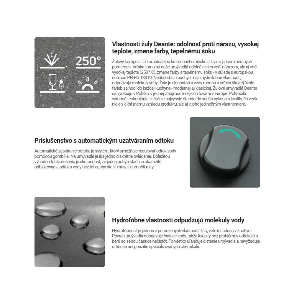 A hidrofóbitás a gránit egyik természetes tulajdonsága, nagyon kívánatos a konyhában. A mosogató felülete taszítja a vízrészecskéket, így a cseppek gond nélkül lefolynak és magukkal viszik a szennyeződésrészecskéket. Mindez megkönnyíti a mosogató tisztítását, és nem igényel súrolást vagy speciális vegyszerek használatát.