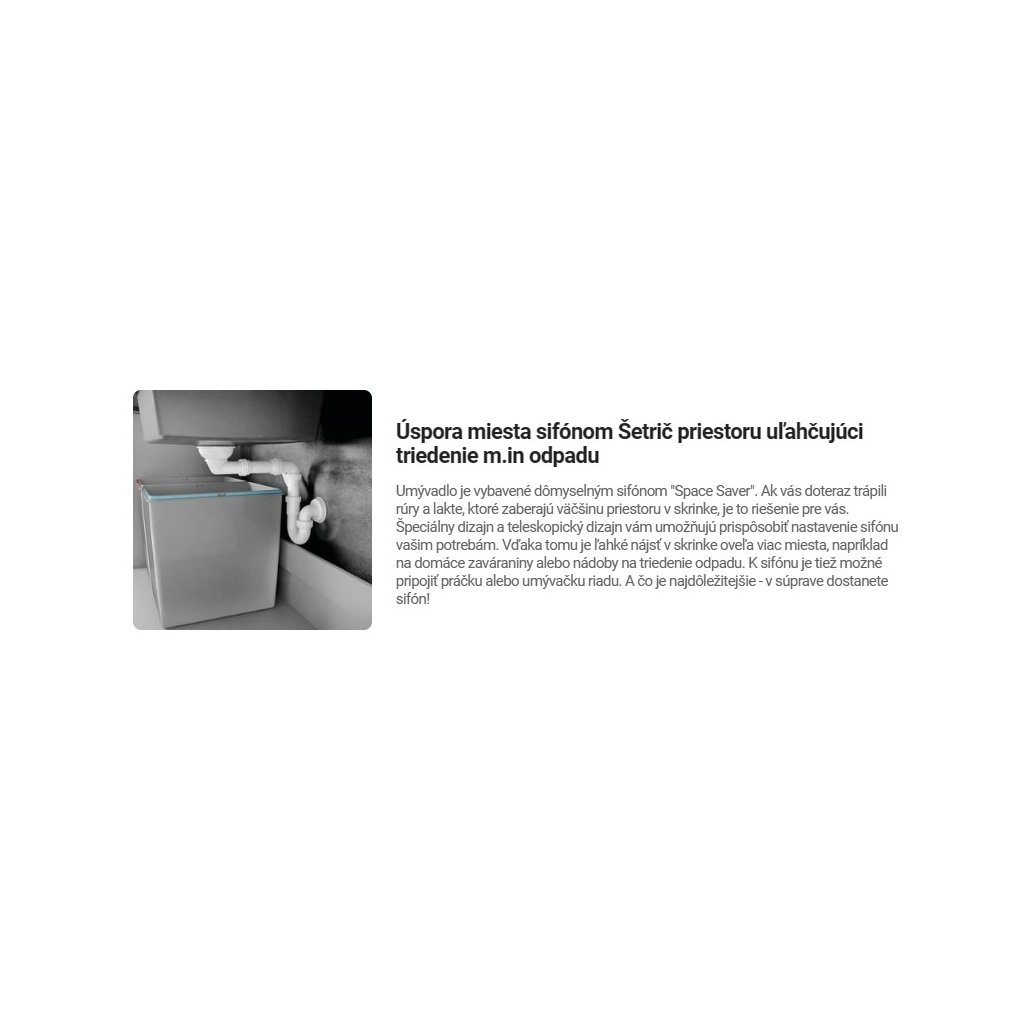 - Helytakarékosság a mosogató alatti szekrényben a Space-Saver típusú szifonnal → megkönnyíti például a hulladékok válogatását és hasonlókat