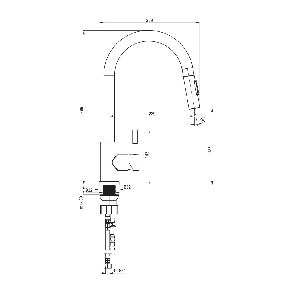 - Típus: mosogató csaptelep "U" alakú karral, kihúzható spray-vel