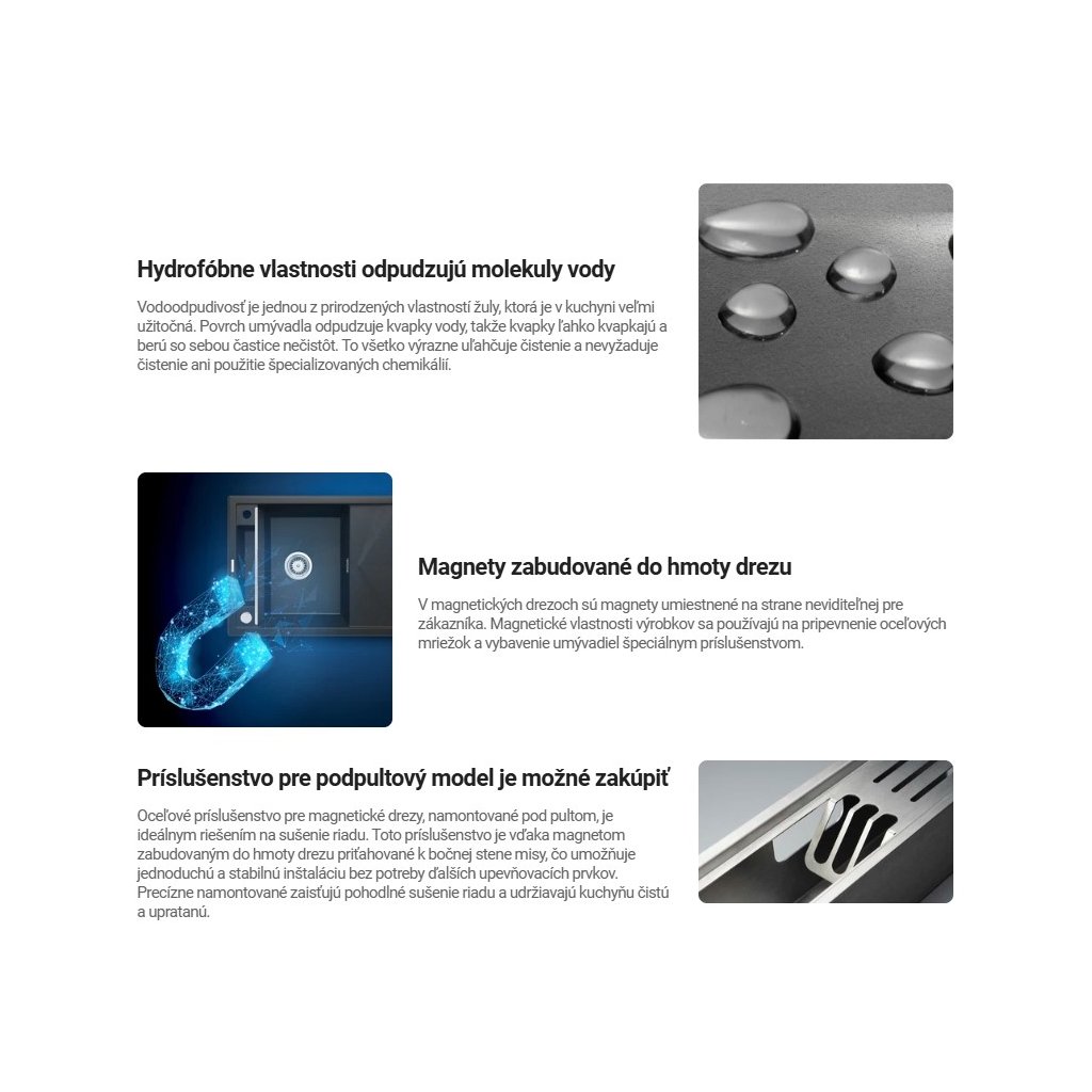 A vízlepergető képesség a gránit egyik természetes tulajdonsága, amely nagyon hasznos a konyhában. A mosogató felülete taszítja a vízcseppeket, így a cseppek könnyen lecsepegnek és magukkal viszik a szennyeződésrészecskéket. Mindez jelentősen megkönnyíti a tisztítást, és nem igényel tisztítást vagy speciális vegyszerek használatát.