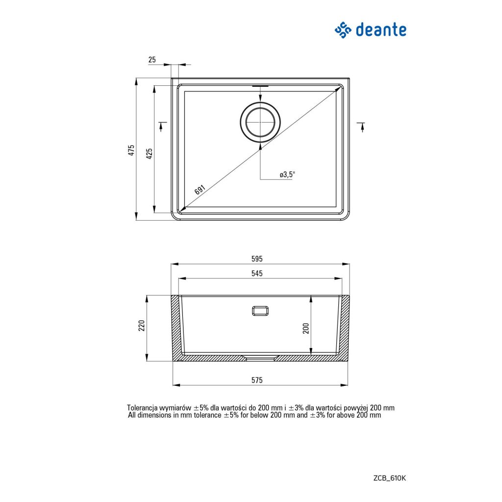 Deante Sabor, kerámia alászerelt mosogató B/O 595x475x220 mm + helytakarékos szifon, 1 kamrás, fehér, ZCB_610K