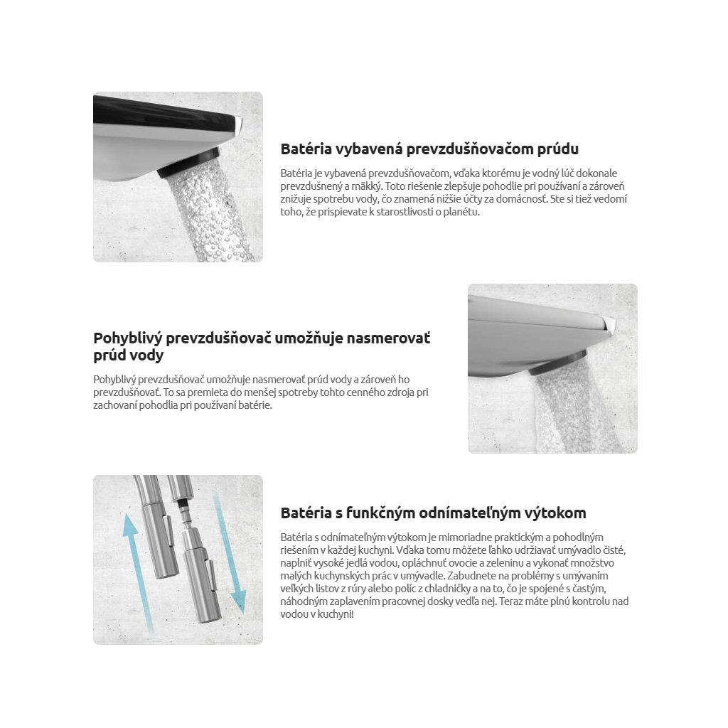 A kivehető kifolyócsővel ellátott csaptelep rendkívül praktikus és kényelmes megoldás minden konyhában. Ennek köszönhetően könnyedén tisztán tarthatja a mosogatót, megtöltheti vízzel a magas edényeket, leöblítheti a gyümölcsöket és a zöldségeket, valamint számos kisebb konyhai feladatot is elvégezhet a mosogatóban. Elfelejti a nagy lapok sütőből vagy a hűtőszekrényből való polcok mosásával kapcsolatos problémákat, és azt, ami a mellette lévő munkalap gyakori, véletlen elöntésével jár. Most már teljes mértékben uralja a vizet a konyhában!