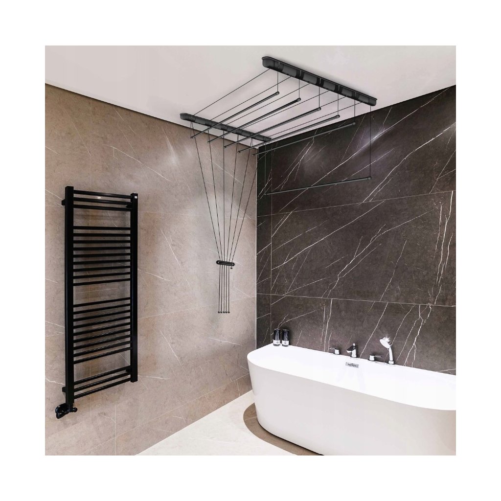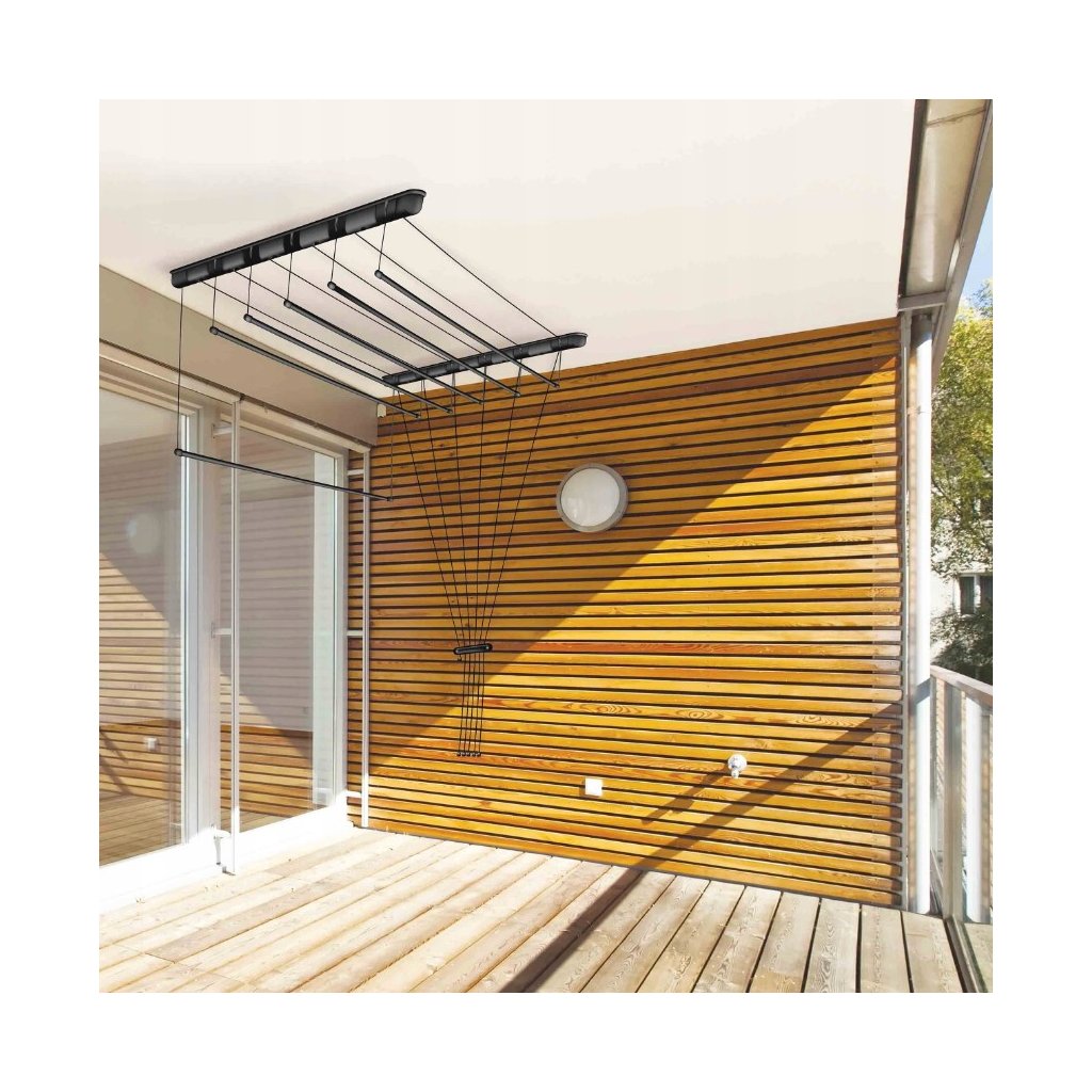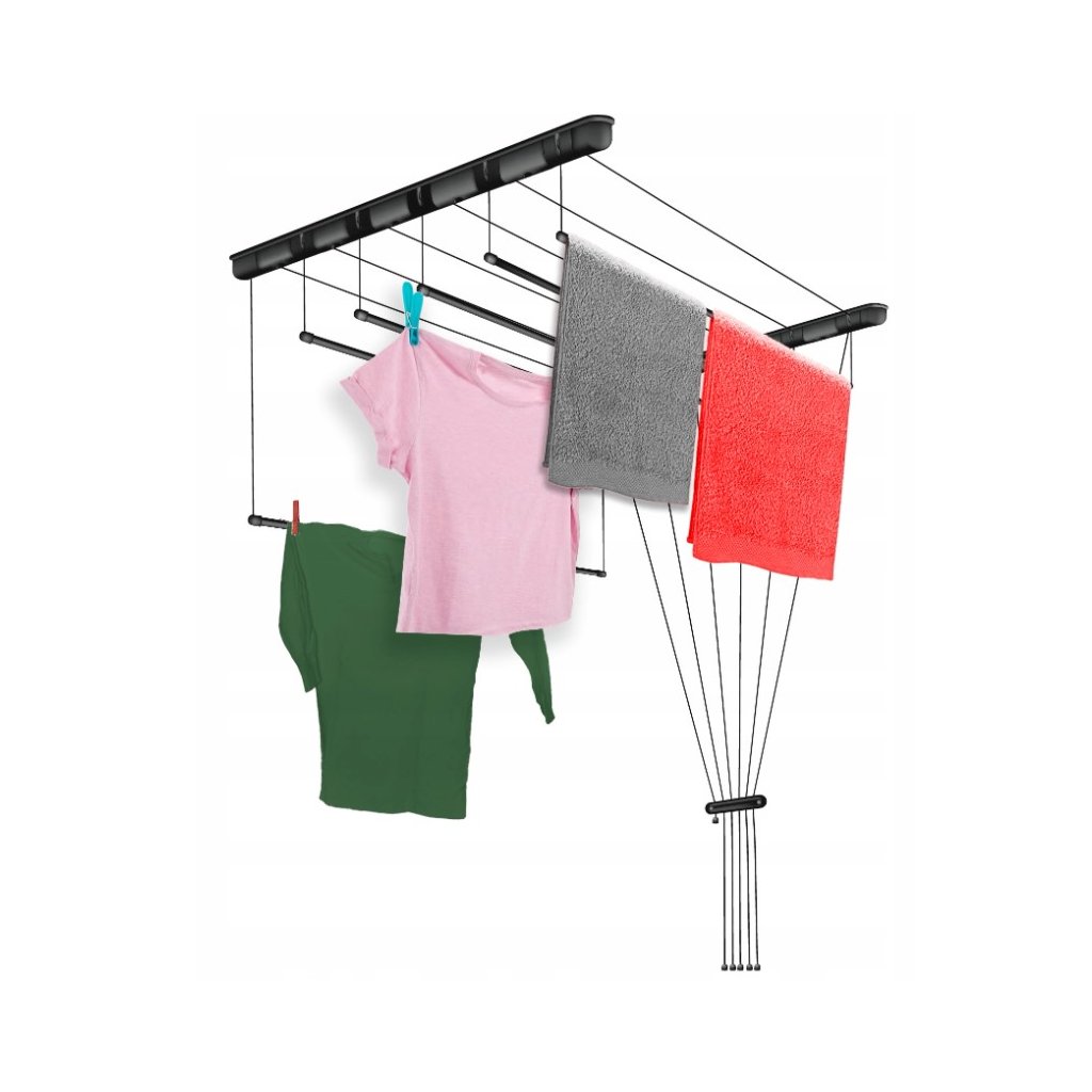Fekete akasztós ruhatartót keresel, amely sok helyet takarít meg? Bel- és kültéren is működő termék? Tekintse meg mennyezeti 7 soros ruhaszárítónkat. Mennyezeti szárítónkkal olyan helyet alakíthat ki, ahol száríthatja a ruhaneműt anélkül, hogy túl sok helyet foglalna. Ez a termék legfeljebb 3 méter magas helyiségbe telepíthető. Alkalmas ruhaneműk beltéri és kültéri szárítására. Kiváló időjárás- és nedvességállósággal rendelkezik, így nem kell tartania a korróziótól.