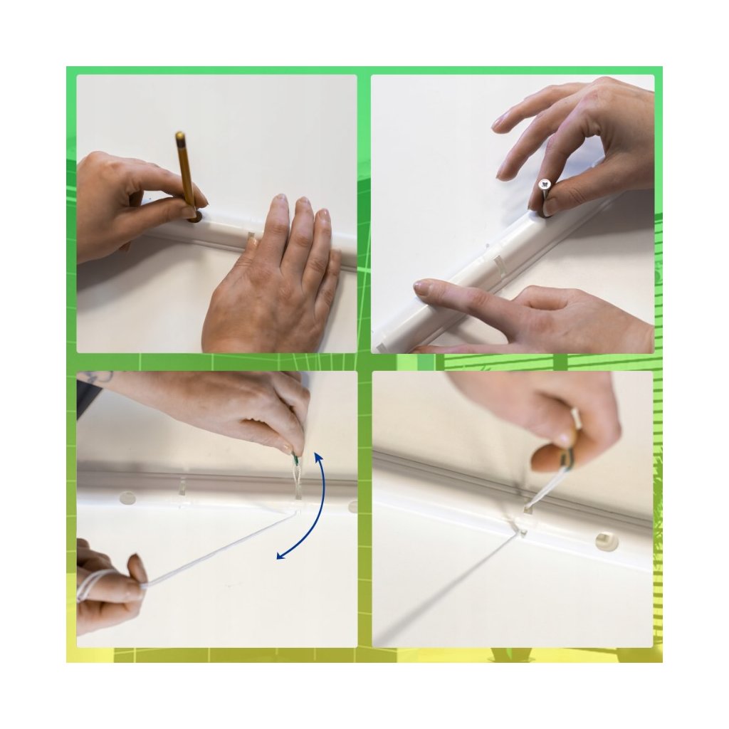 ✔️Mennyezeti akasztót kapsz már menetes vezetékkel , ami jelentősen felgyorsítja és megkönnyíti a telepítést. ✔️Nem kell mást tenned, mint rögzíteni mennyezeti csíkok 2 cm-rel kevesebb, mint a felfüggesztő rúd hossza. És akkor rögzíti a falhoz kábel fali zár . ✔️A következő lépés a rudak felszerelése - a lécekben lévő görgőkön áthúzva a zsinórokat rögzítheti. ✔️Végül rögzítse két rögzítő láb és szerelje fel a maradék rudakat. | |