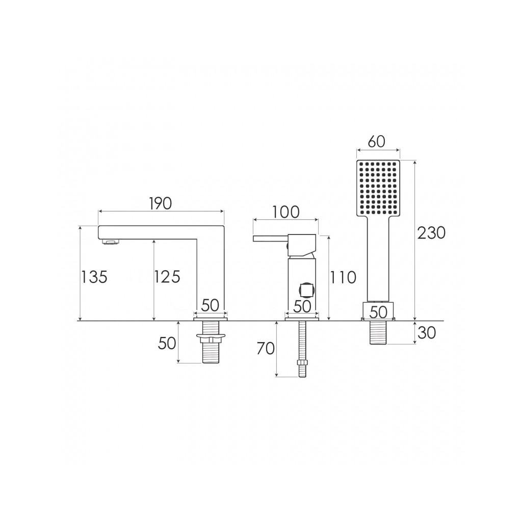 - Szett típusa: 3 lyukú kádcsaptelep, egykaros, kapcsolóval és kézizuhannyal