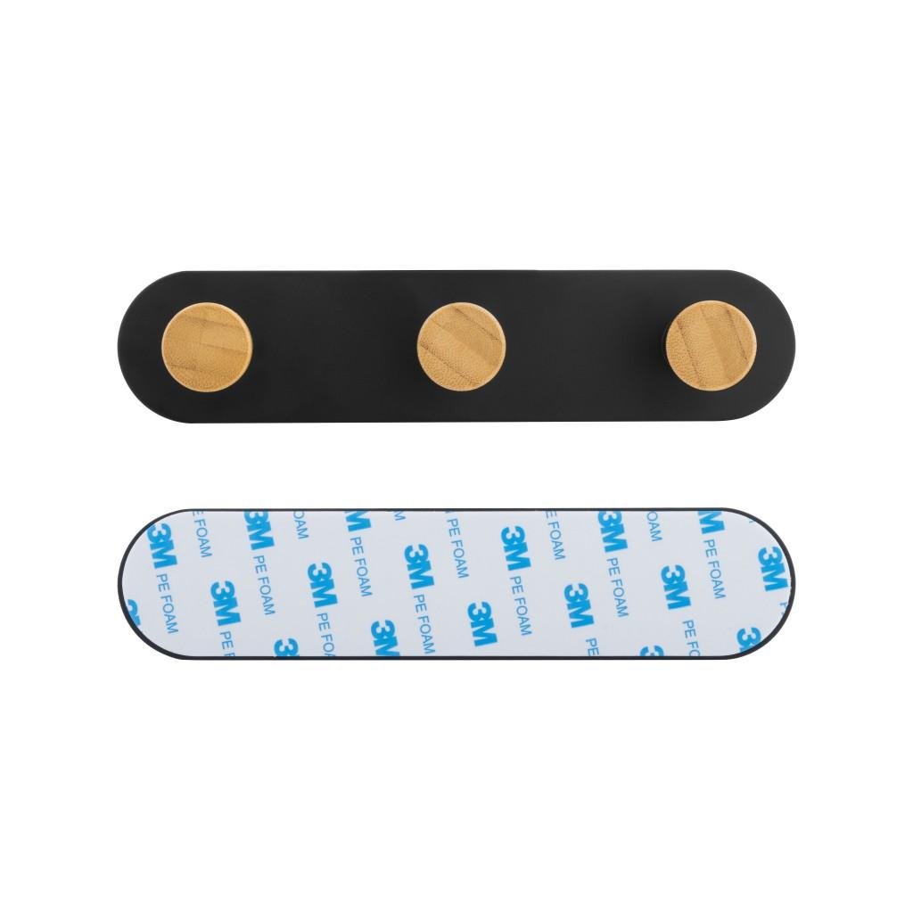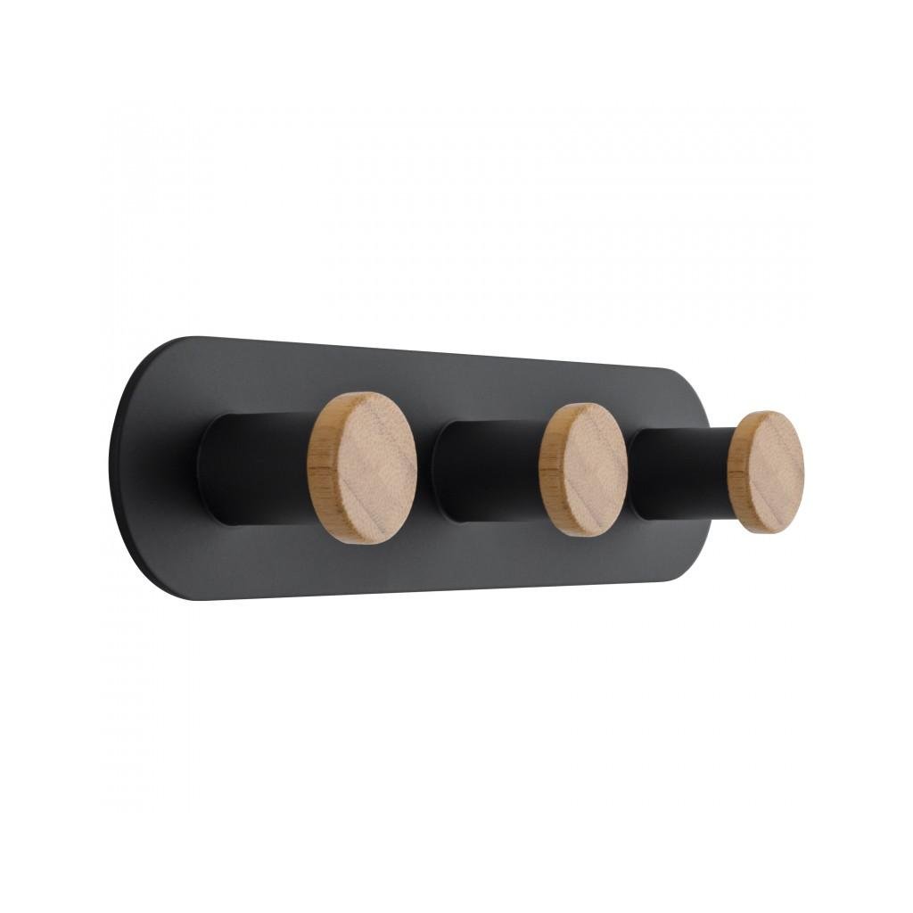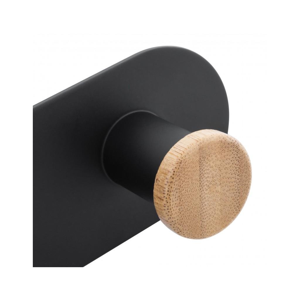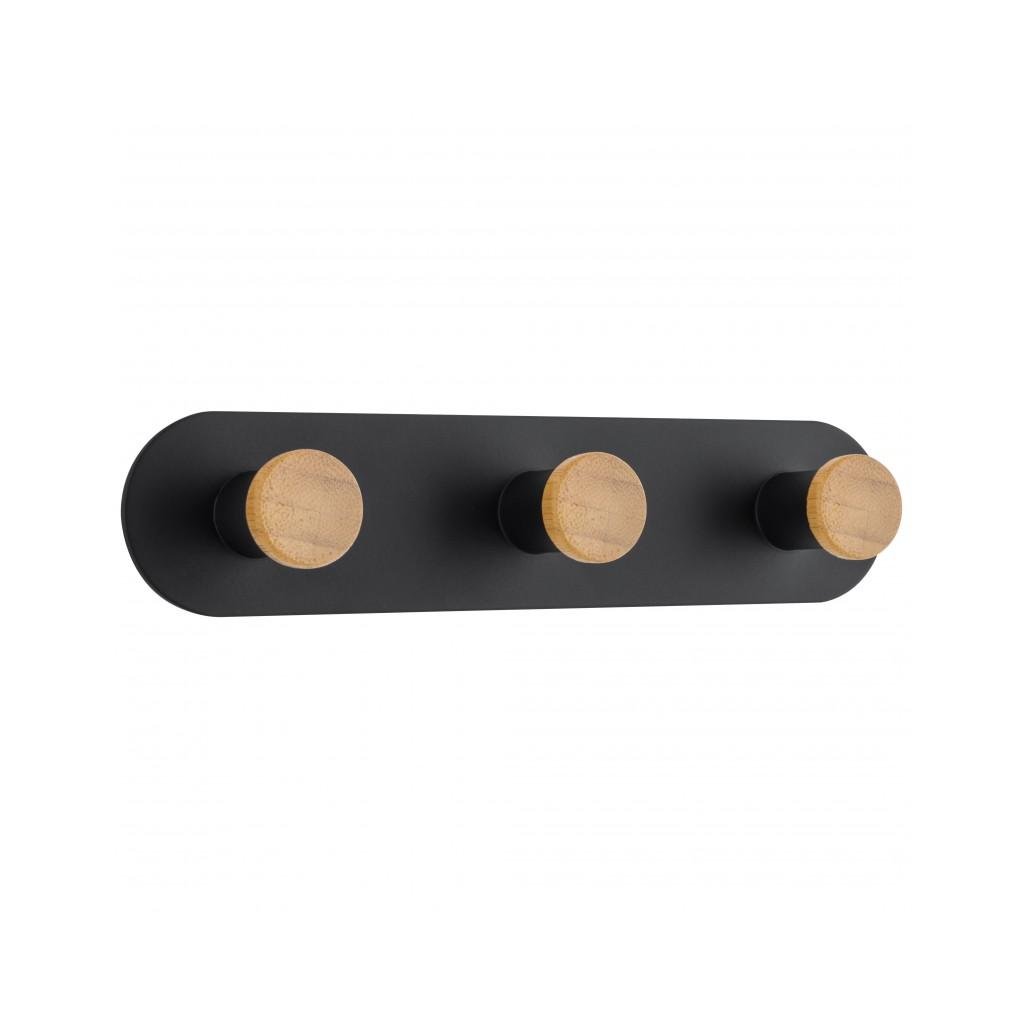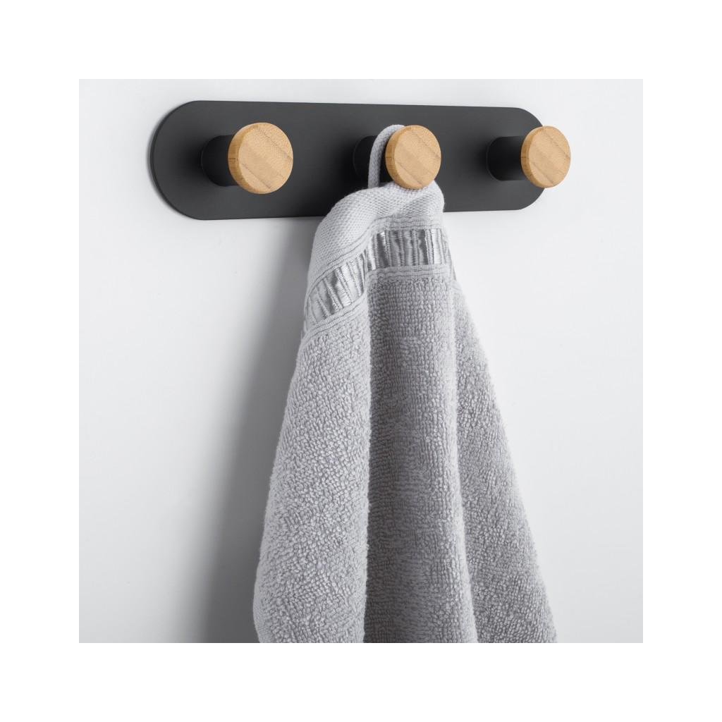 Fürdőszoba törölközőtartó, 3M szalaggal a falra rögzítve. Három horog van rajta. Kiváló minőségű fekete porszórt acélból készült. A fogantyúk végén természetes bambuszfából készült díszítőelem található.