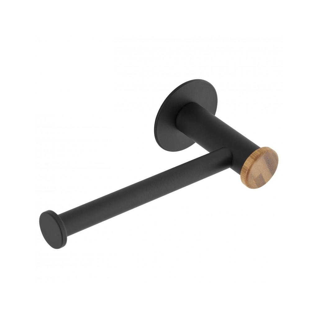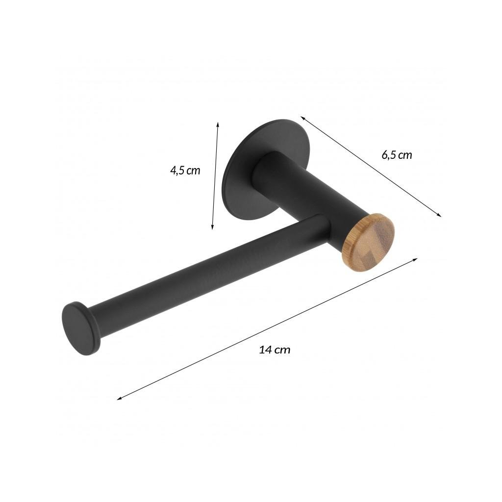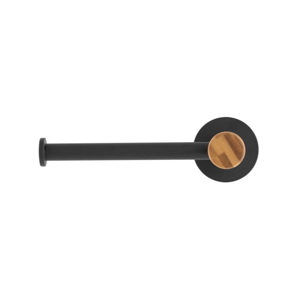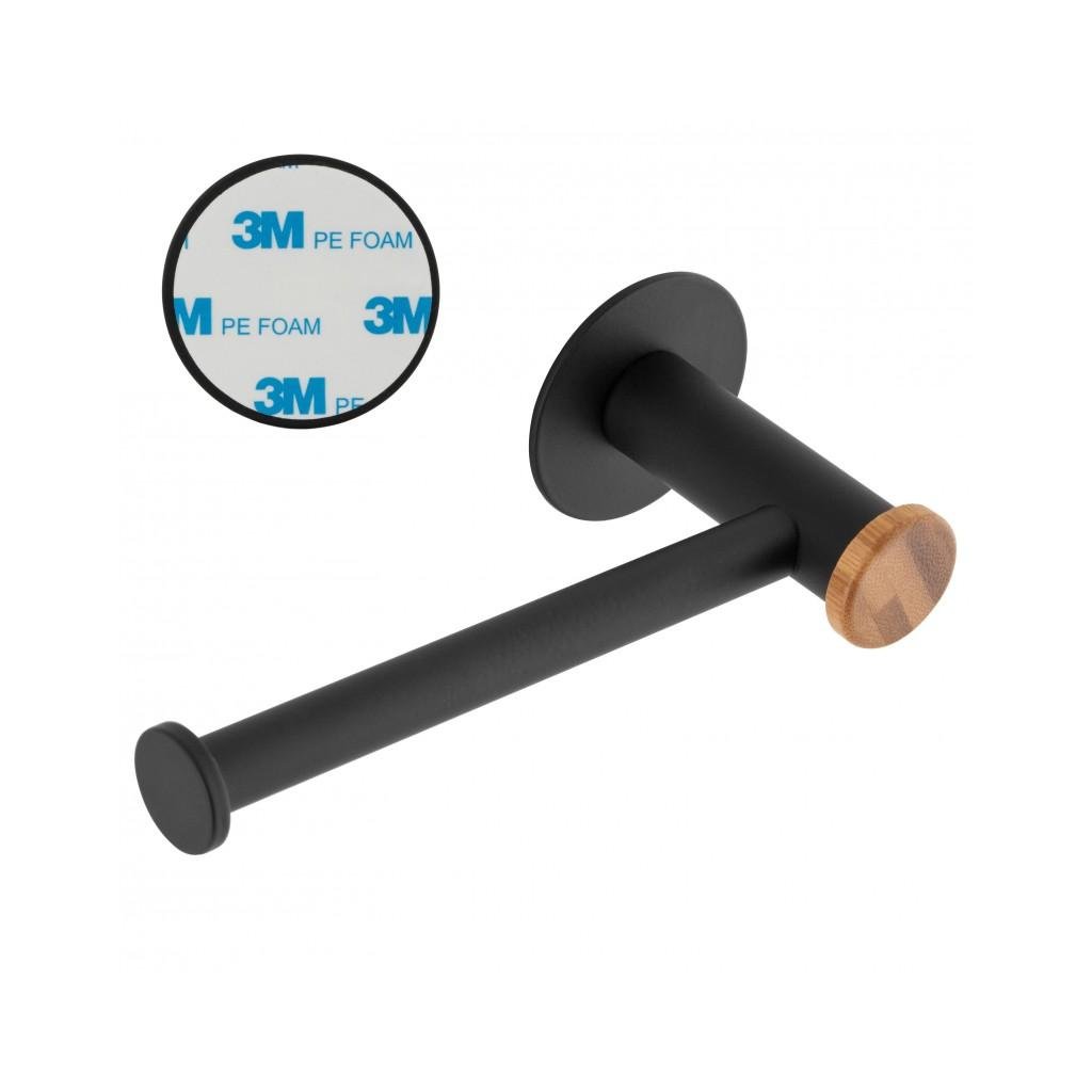 Elegáns WC-papír tartó 3M szalaggal rögzítve. A fogantyú kiváló minőségű fekete porszórt acélból készült. Természetes bambuszfából készült díszítőeleme van.