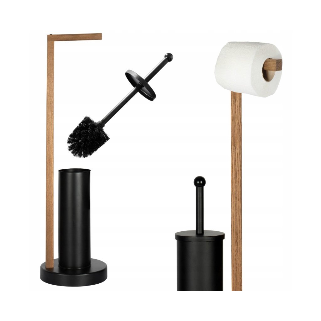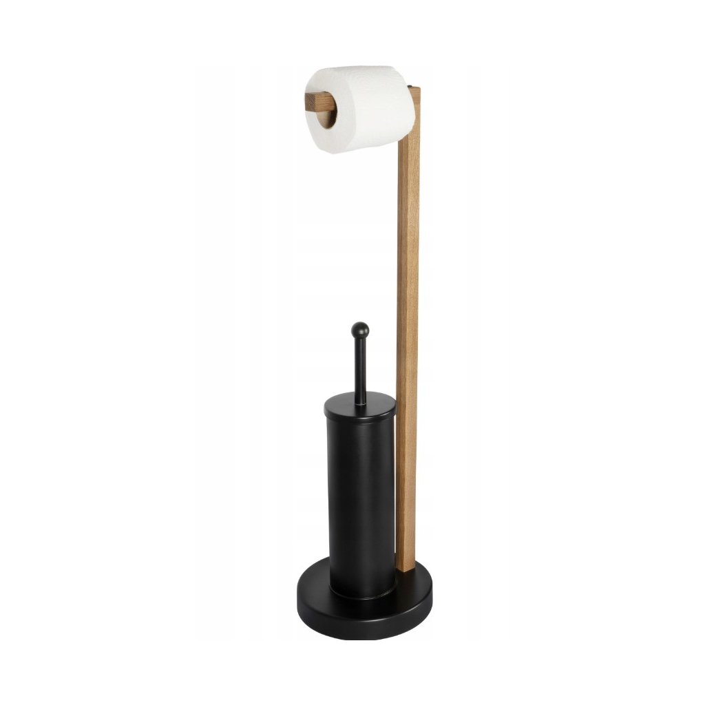 Szabadon álló WC-kefe, beépített WC-papír tartóval kőrisfából. Az állvány kiváló minőségű fekete acélból és FSC-tanúsítvánnyal rendelkező fából készült. Az állvány szilárd alappal rendelkezik, kerek alakú a stabilitás érdekében. A kefetartó műanyag védőtartályt tartalmaz, amely véd a rozsdától és megkönnyíti a tisztítást. A könnyű keret megkönnyíti az állvány megfelelő helyre történő mozgatását. Az állvány önálló összeszerelésre szolgál, eredetileg kartondobozba csomagolva. A csomag tartalmazza a WC állvány összeszereléséhez szükséges összes alkatrészt.