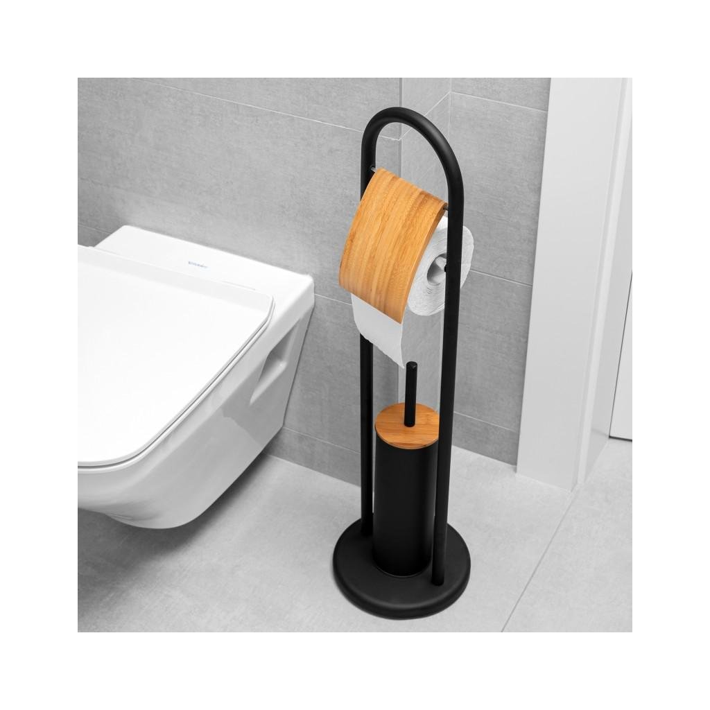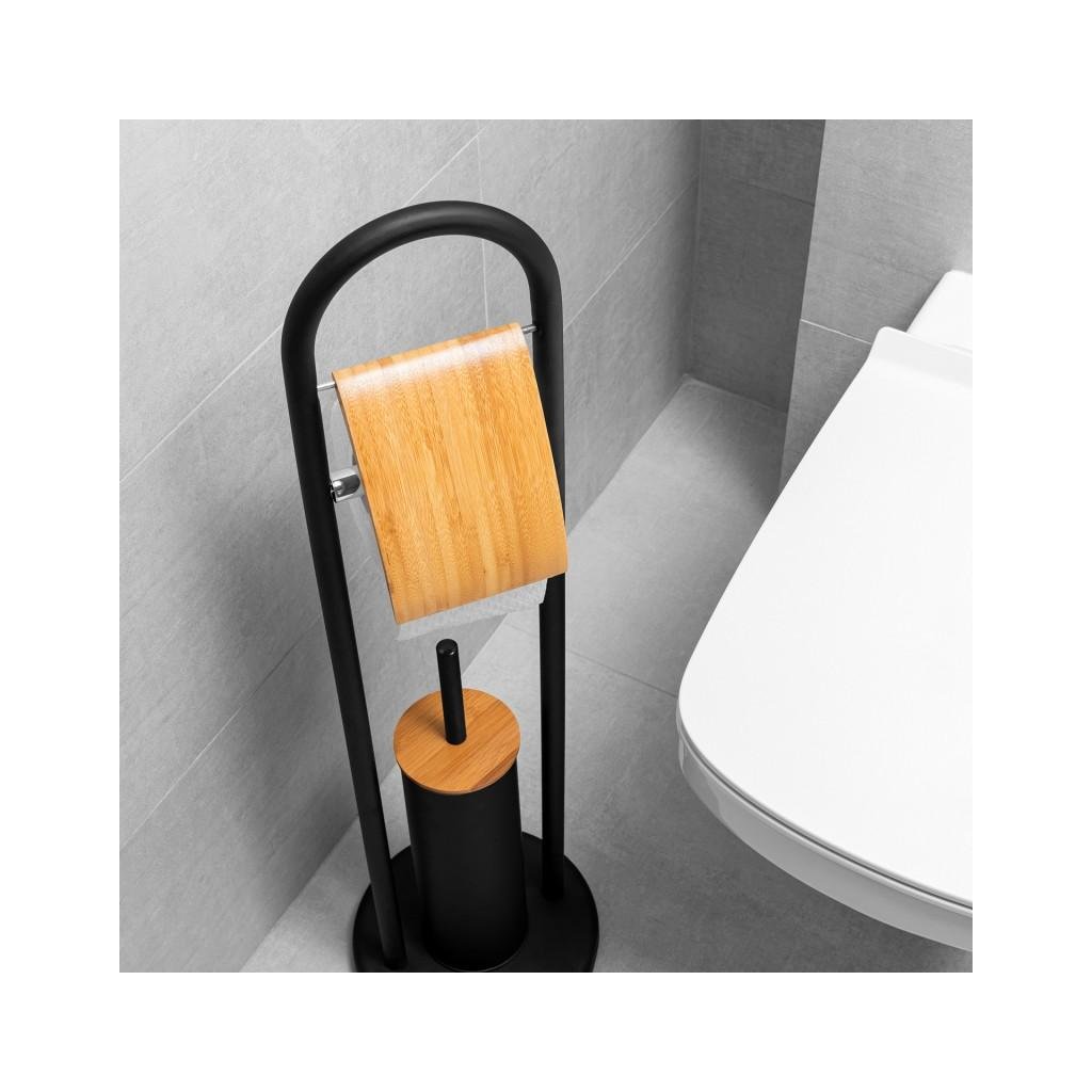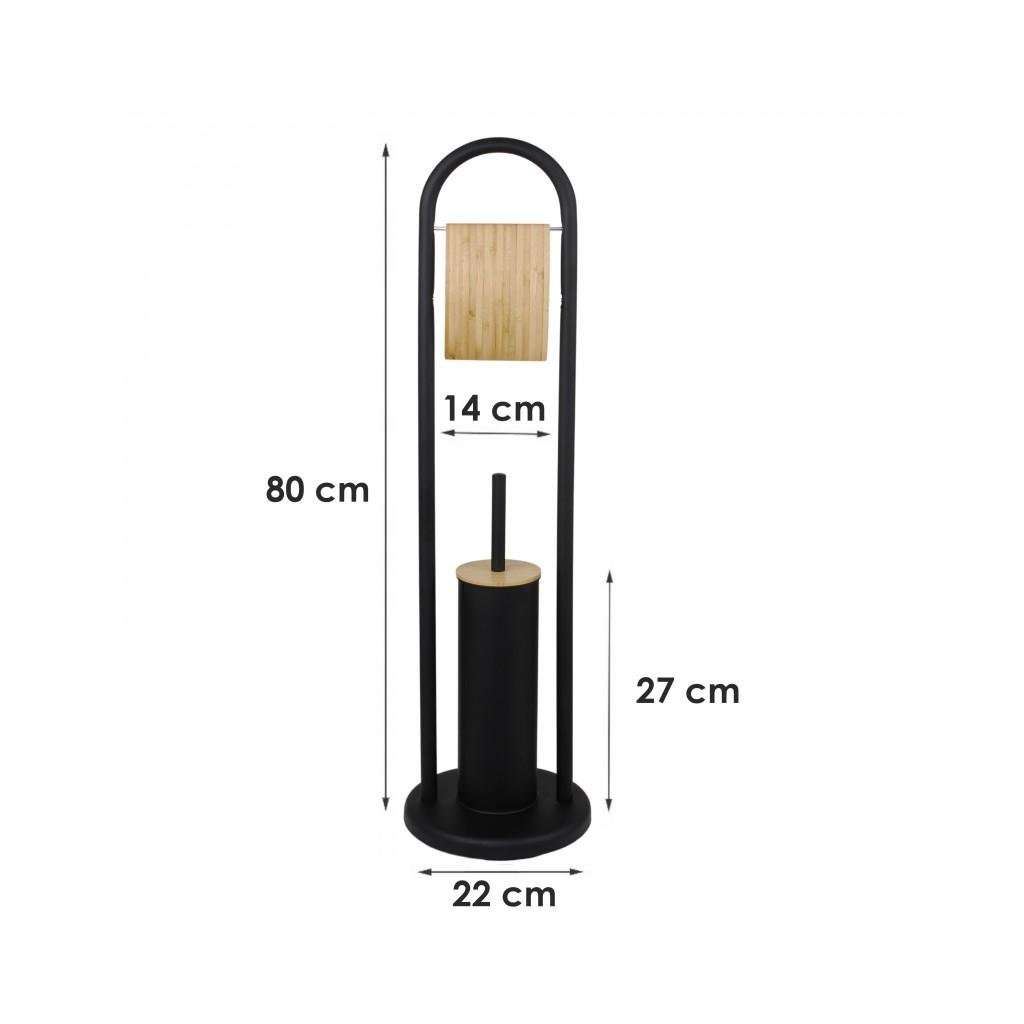 WC-állvány WC-kefével és WC-papír tartóval, füllel. Kiváló minőségű fekete porszórt acélból készült. Természetes bambuszfából készült díszítőelemek. A WC kefe műanyag tartálya véd a rozsdától és megkönnyíti a tisztítást. A csúszásgátló talp nagy stabilitást biztosít az állványnak.