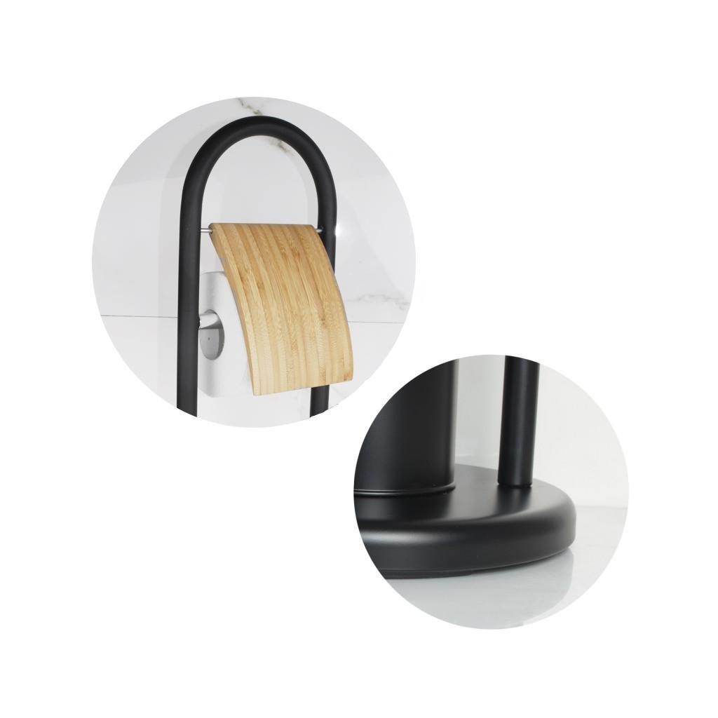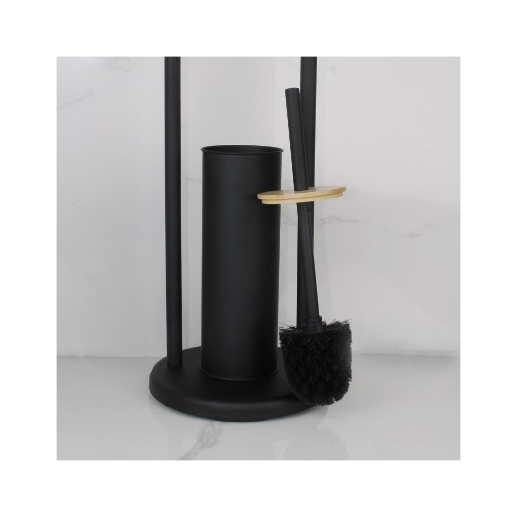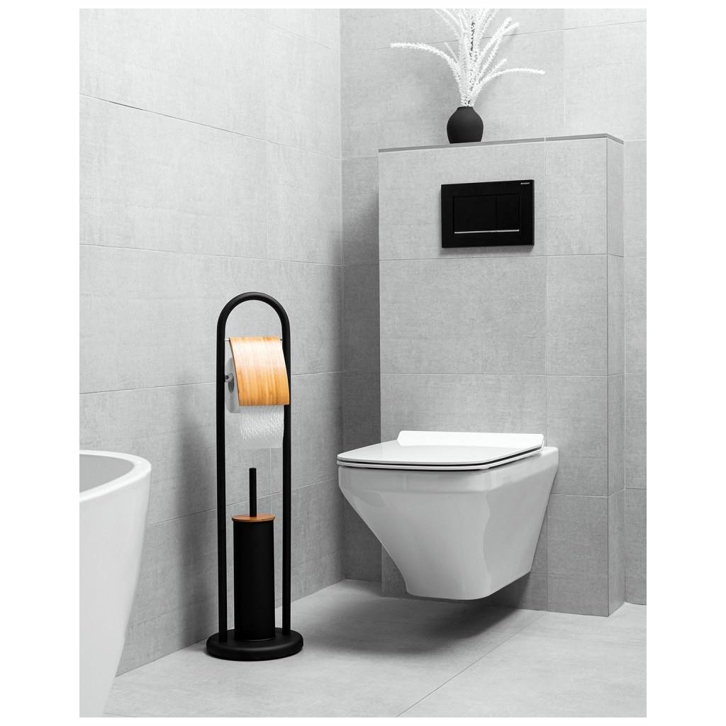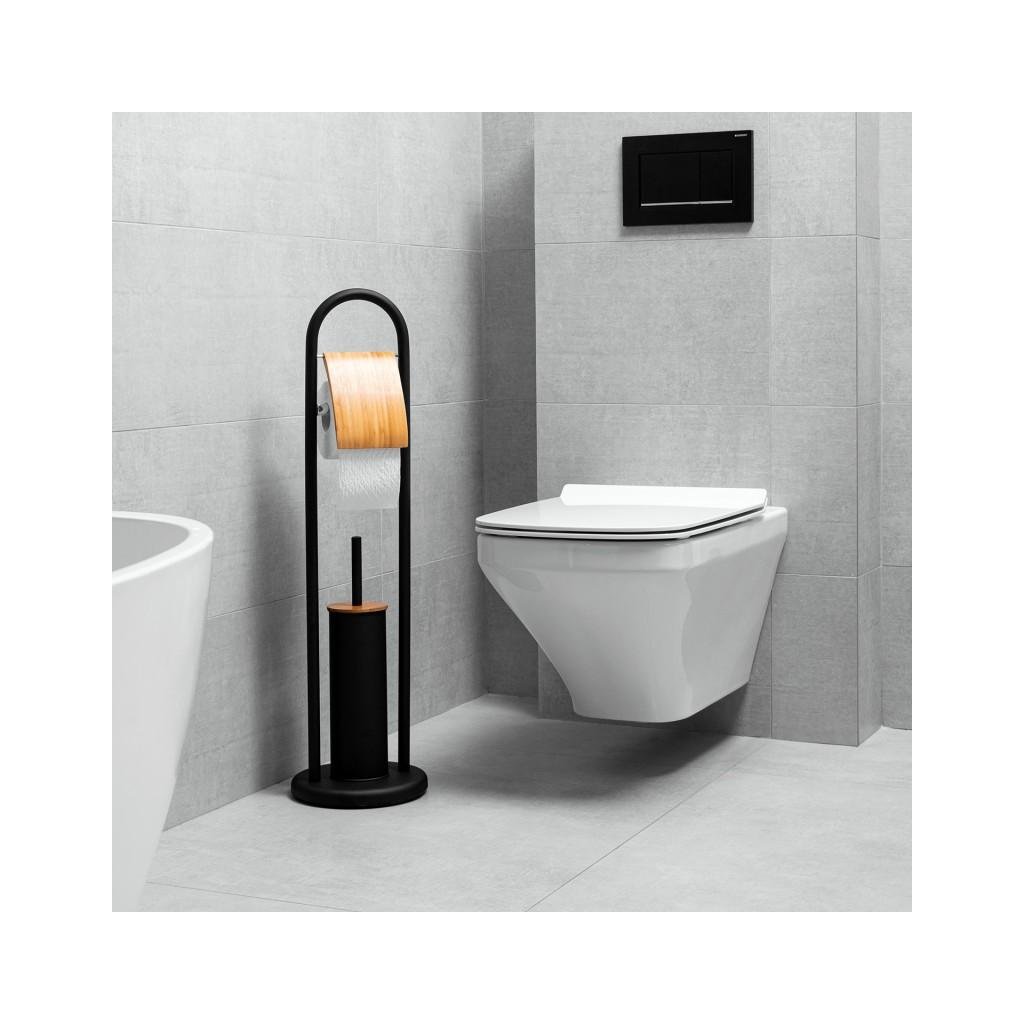 WC-állvány WC-kefével és WC-papír tartóval, füllel. Kiváló minőségű fekete porszórt acélból készült. Természetes bambuszfából készült díszítőelemek. A WC kefe műanyag tartálya véd a rozsdától és megkönnyíti a tisztítást. A csúszásgátló talp nagy stabilitást biztosít az állványnak.