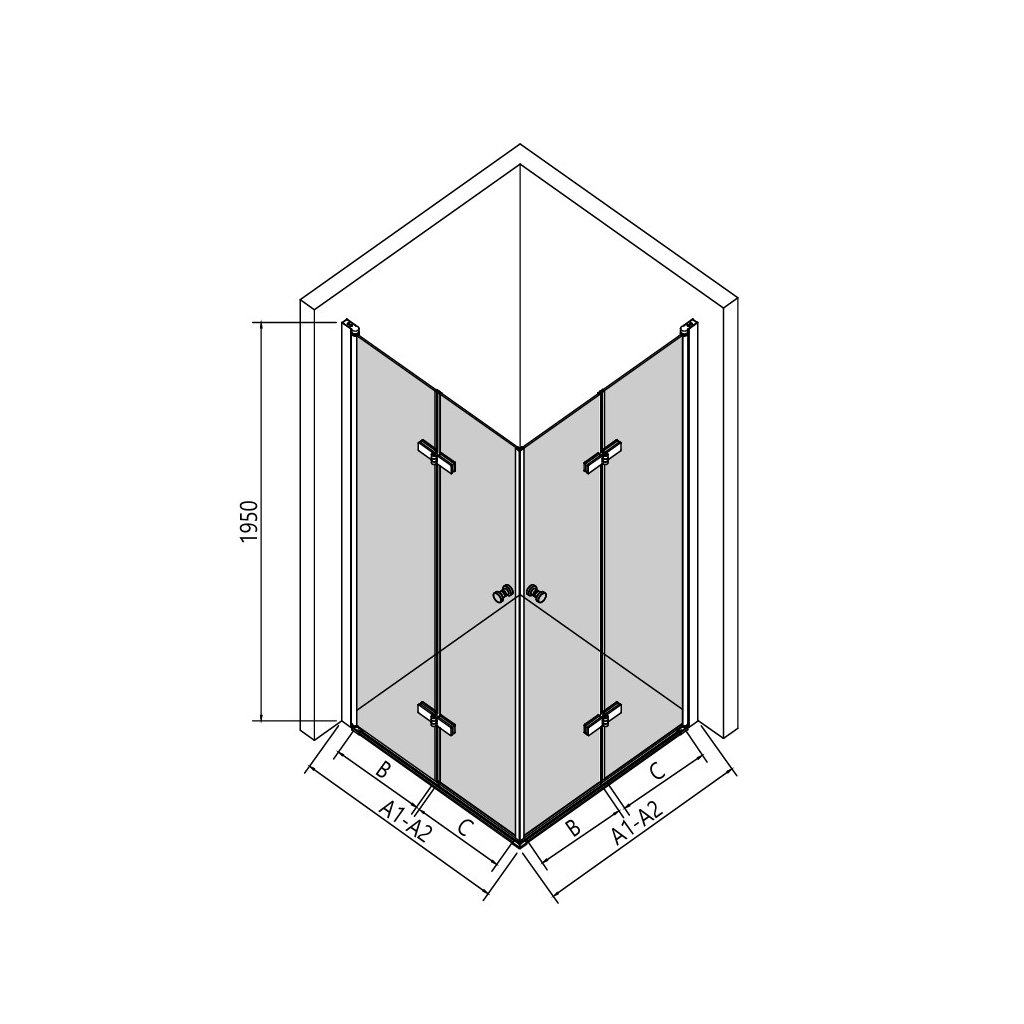 - Típus: sarok zuhanykabin dupla összecsukható ajtókkal