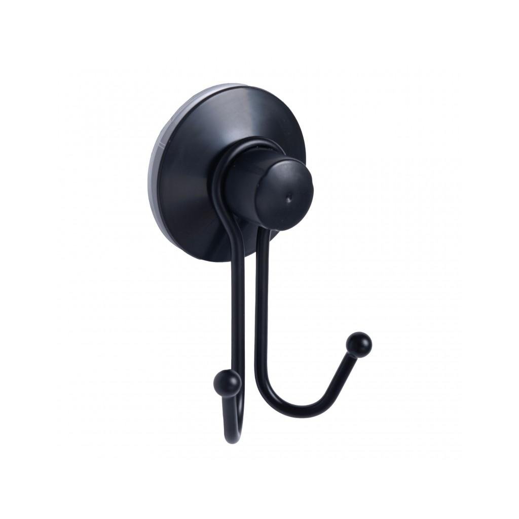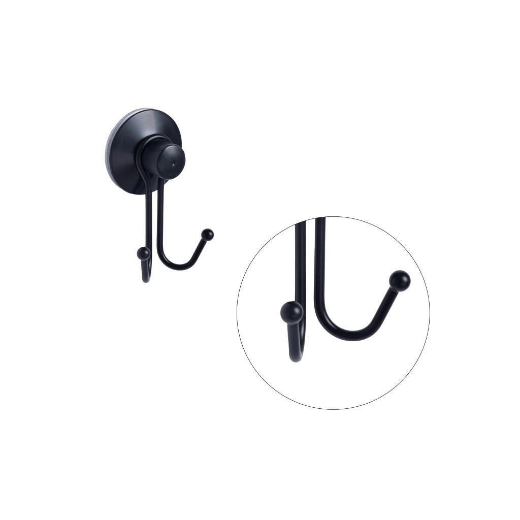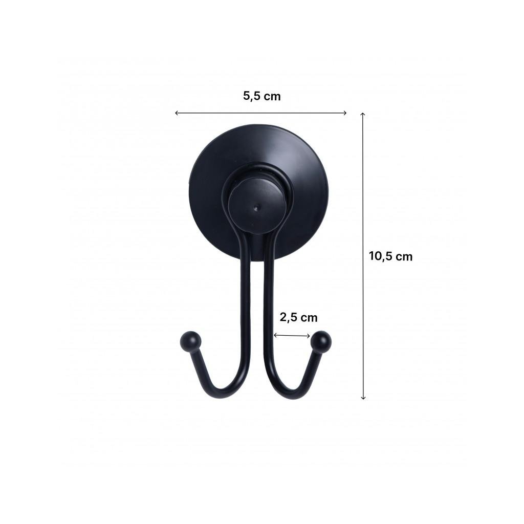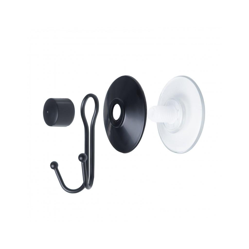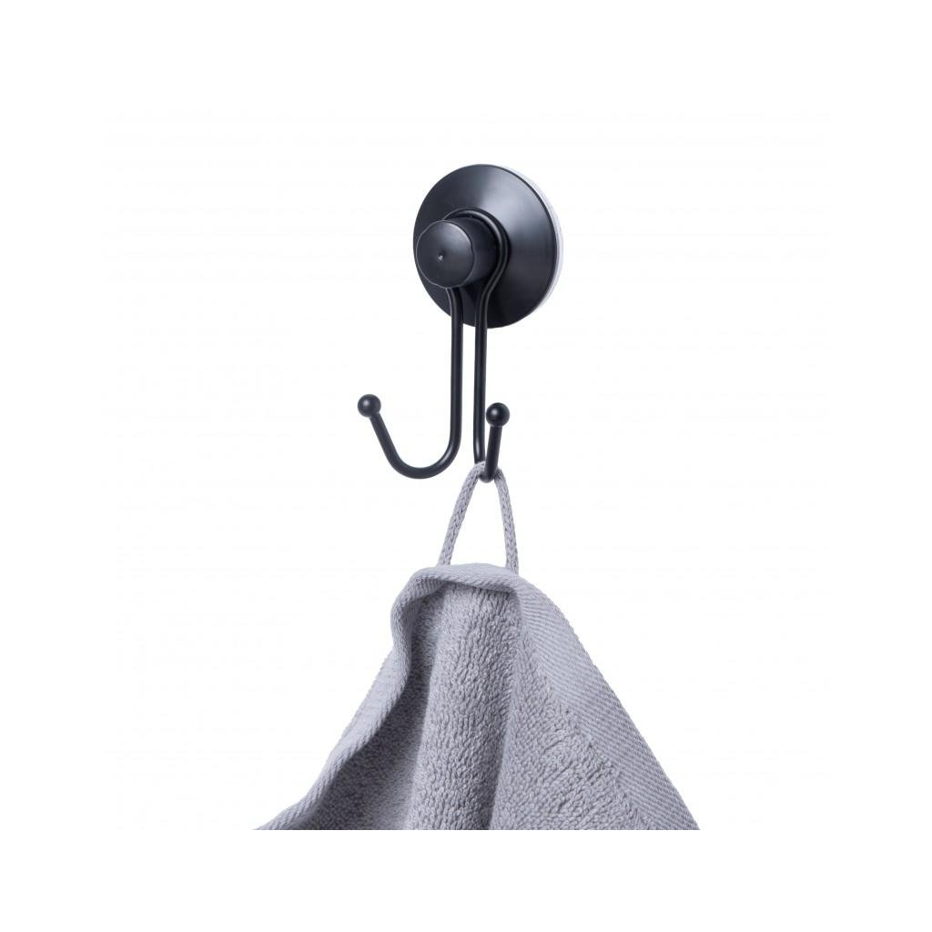 Fürdőszoba akasztó 2 kampóval, mely tapadókoronggal rögzíthető a falra. Acélból készült fekete színben. Gyors, egyszerű és biztonságos telepítést garantál. Nincs szükség fúrásra vagy ragasztásra. A szétszerelés nem hagy nyomot. Javasoljuk, hogy sima felületeken használja, mint például mázas csempék vagy zuhanyüvegek.