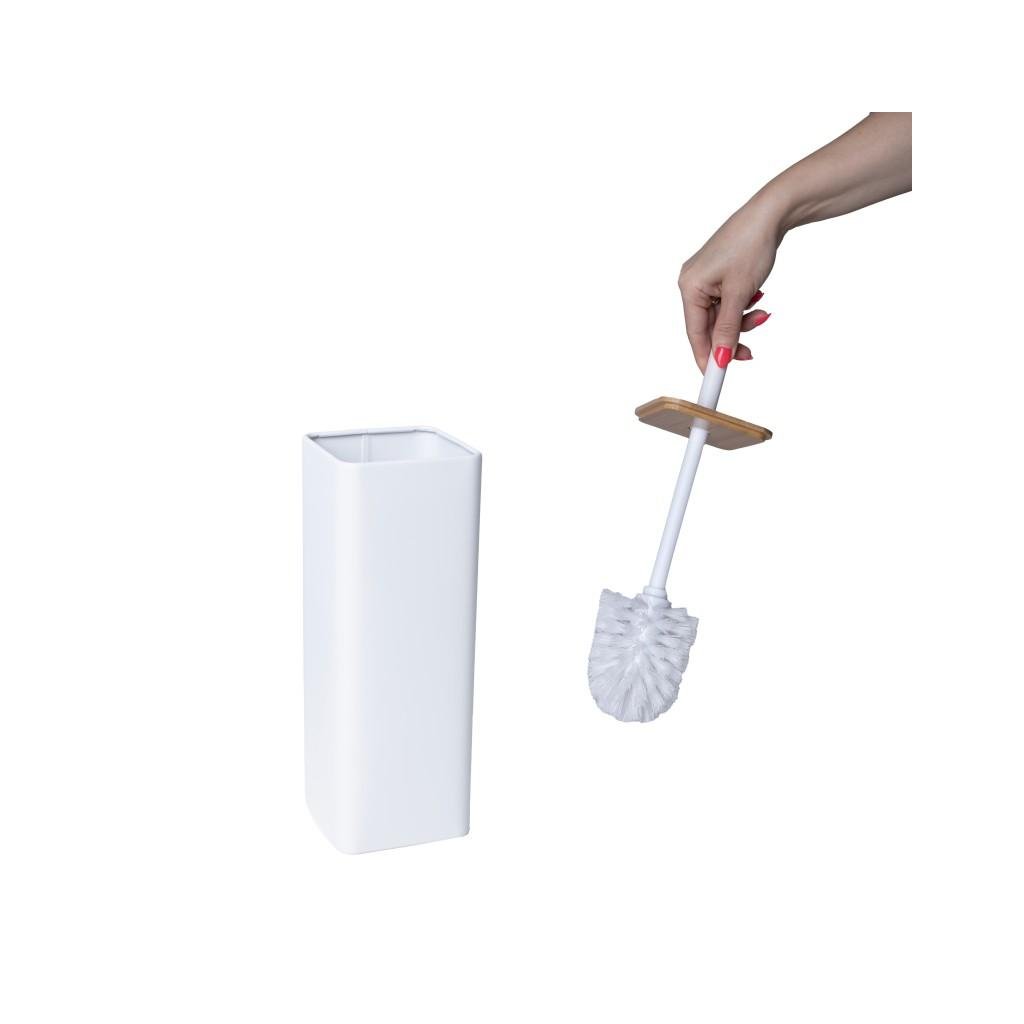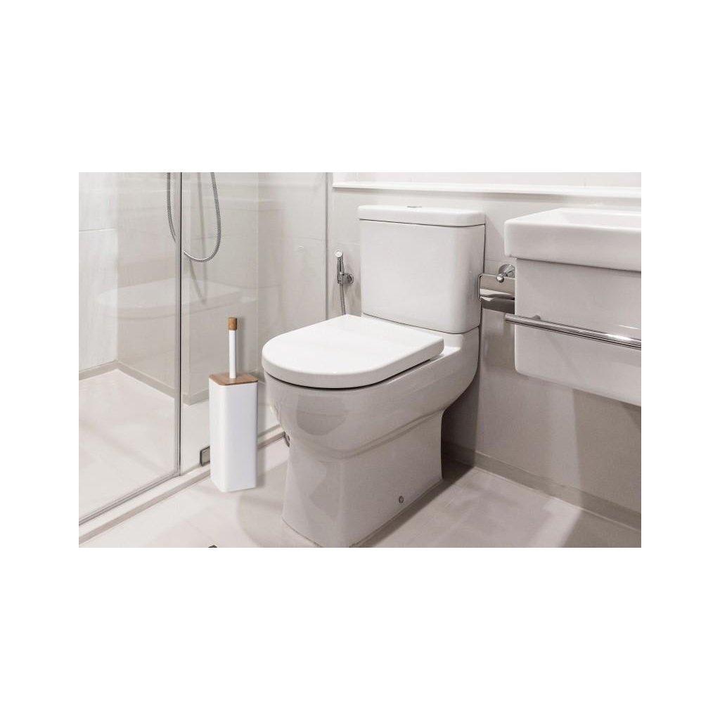 A modern és stílusos fekete WC-kefe bambusz elemekkel tökéletes kiegészítője minden fürdőszobának. Nemcsak praktikum, hanem esztétikus megjelenés is, amely kiemeli ennek a helyiségnek az eleganciáját. A fa díszítőelemek tökéletesen kontrasztosak a fehér acél felülettel, modern és meleg hangulatot kölcsönözve a fürdőszobának.