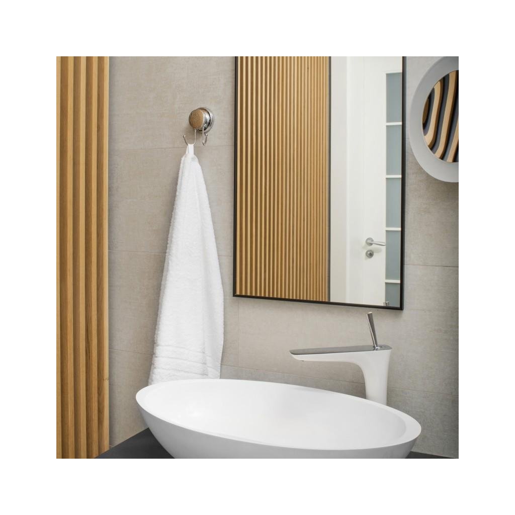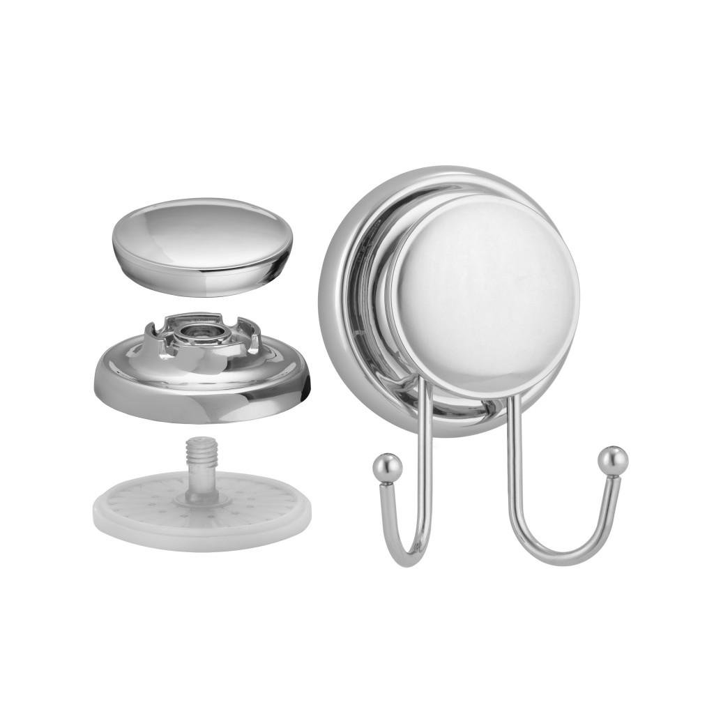 Fürdőszoba akasztó egy akasztóval a falra erős tapadókoronggal. A tapadókorong jellemző tulajdonsága a matt kőedényeken való hatékonysága. Szerkezete egy nagyon vastag gélre hasonlít, ezért jól behatol a porózus felületekbe. Hatékony csempéken, laminátumokon, hűtőszekrényeken, üvegeken és egyéb sima felületeken is. Gyors, egyszerű és biztonságos telepítést garantál. Nincs szükség fúrásra vagy ragasztásra. A szétszerelés nem hagy nyomot.