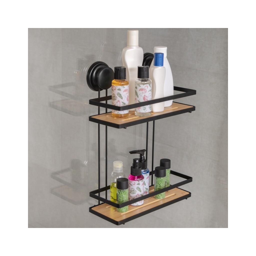 A fürdőszobai polc kiváló minőségű fekete lakkozott acélból készült. Bambuszfából készült dekorációs elemek. A polc két kosárral van felszerelve, amelyeket erős tapadókoronggal rögzítenek a falhoz. A tapadókorong megkülönböztető tulajdonsága a matt porcelán kőedényeken való hatékonysága. Szerkezete egy nagyon vastag gélre hasonlít, így szorosan behatol a porózus felületekbe. Hatékony csempéken, laminátumokon, hűtőszekrényeken, üvegeken és egyéb sima felületeken is. Gyors, egyszerű és biztonságos telepítést garantál. Nincs szükség fúrásra vagy ragasztásra. A szétszerelés nem hagy nyomot. Két nagy tapadókorong és az alattuk lévő stabilizáló lábak biztosítják a kosár helyes és stabil tartását még megrakott állapotban is.