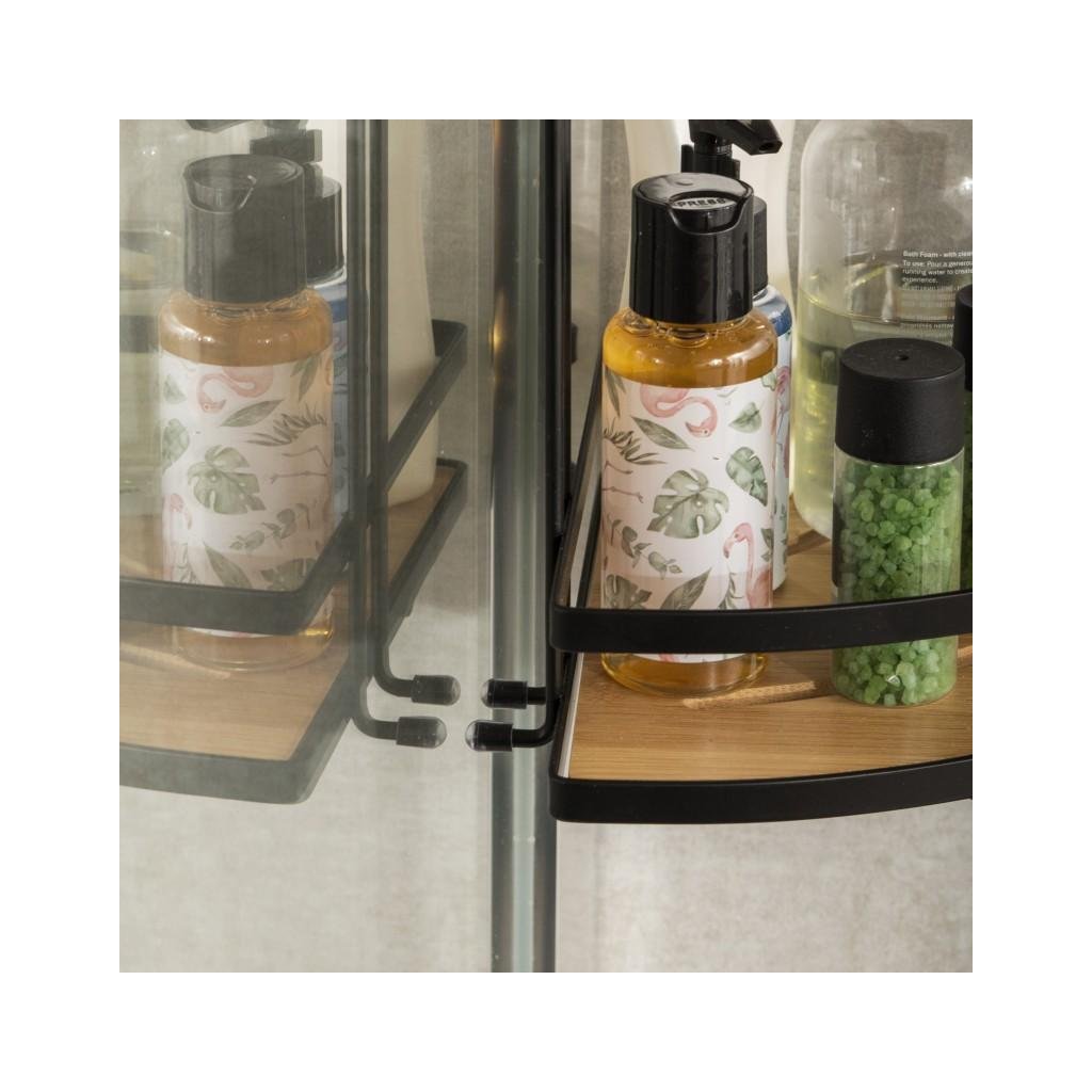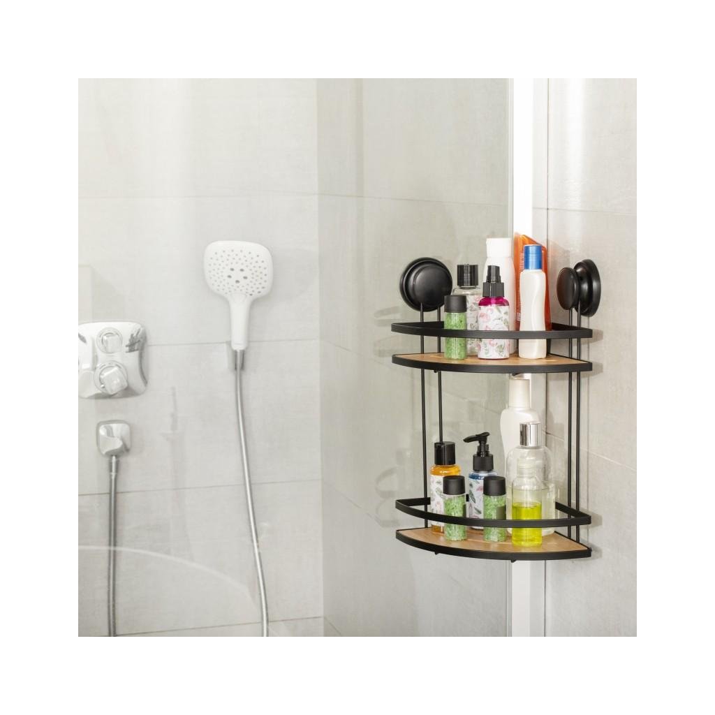 Kiváló minőségű acélból készült sarok fürdőszobapolc. Bambuszfából készült dekorációs elemek. A polc két kosárral van felszerelve, amelyeket erős tapadókoronggal rögzítenek a falhoz. A tapadókorong megkülönböztető tulajdonsága a matt porcelán kőedényeken való hatékonysága. Szerkezete egy nagyon vastag gélre hasonlít, így szorosan behatol a porózus felületekbe. Hatékony csempéken, laminátumokon, hűtőszekrényeken, üvegeken és egyéb sima felületeken is. Gyors, egyszerű és biztonságos telepítést garantál. Nincs szükség fúrásra vagy ragasztásra. A szétszerelés nem hagy nyomot. Két nagy tapadókorong és az alattuk lévő stabilizáló lábak biztosítják a kosár helyes és stabil tartását még megrakott állapotban is.