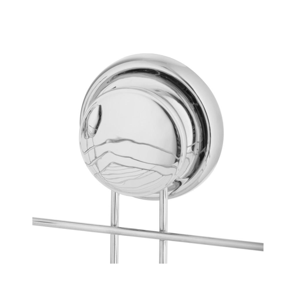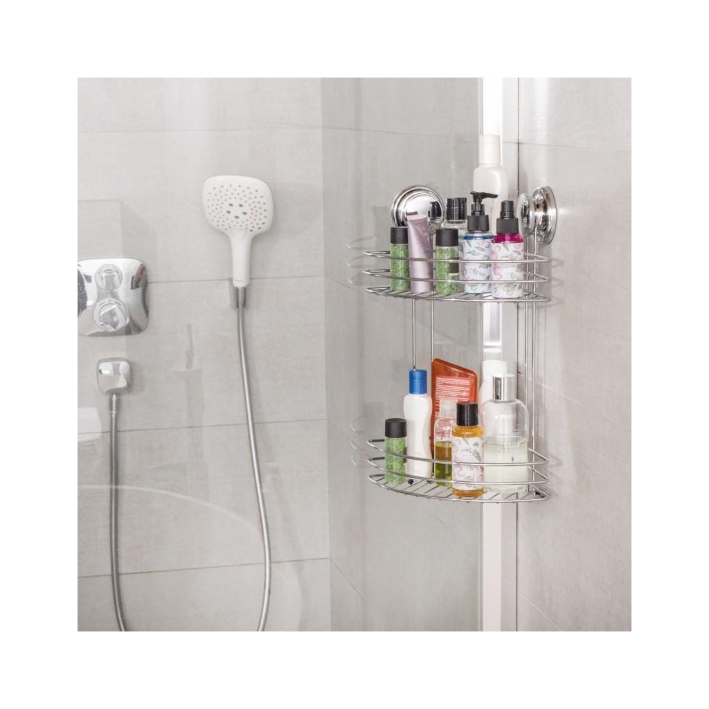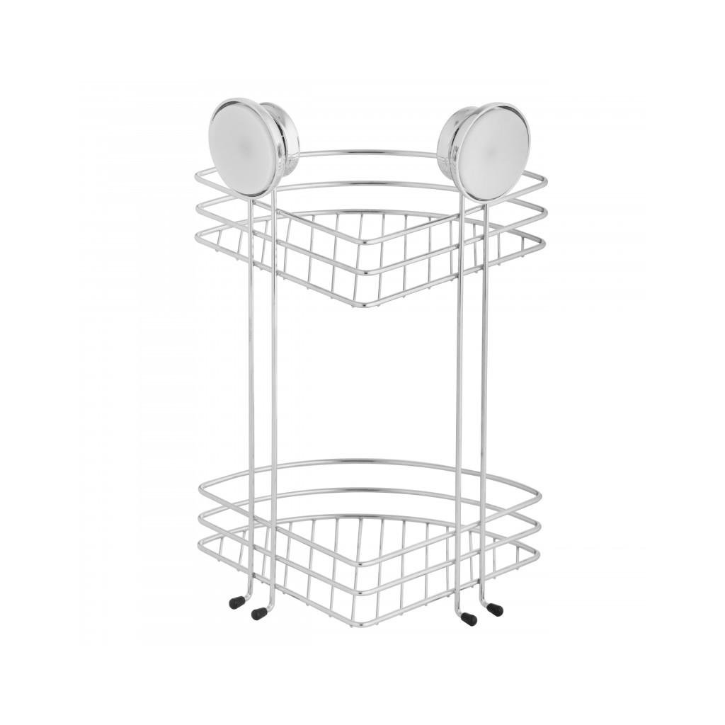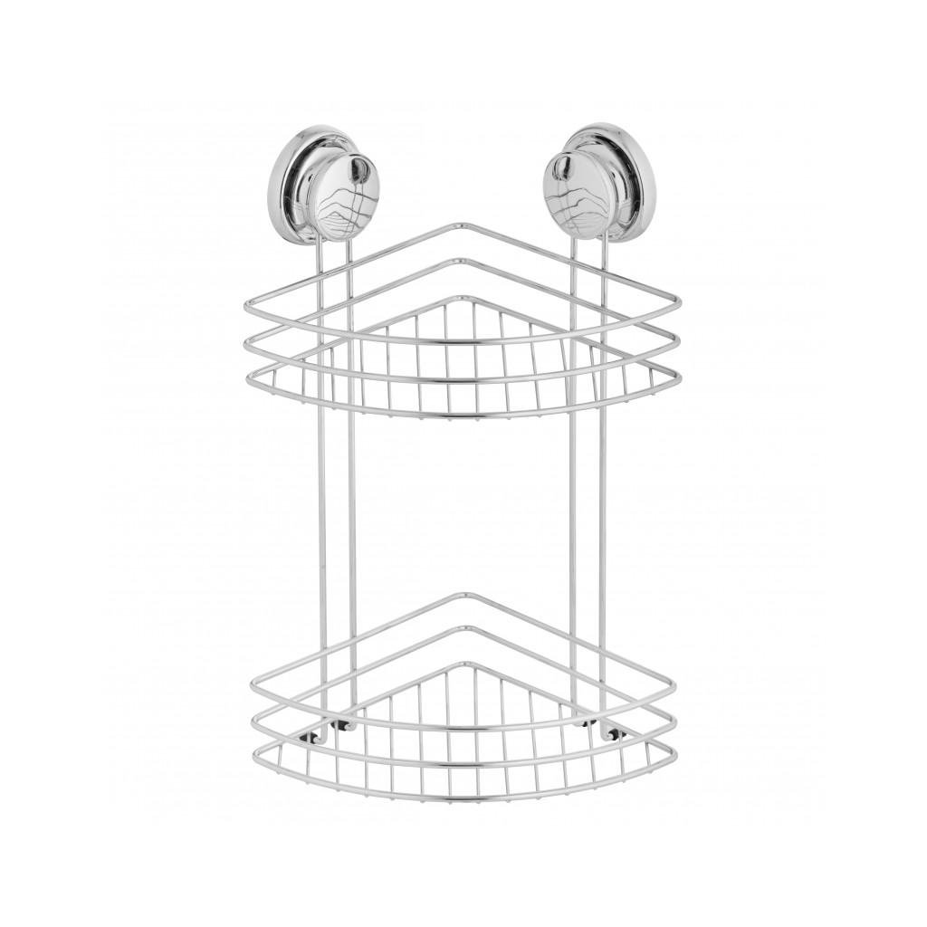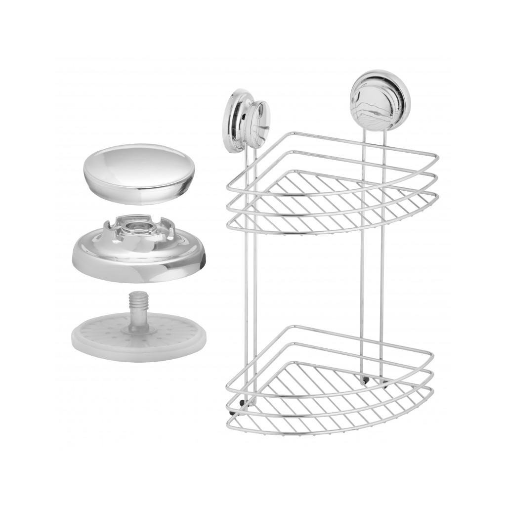 Két kosárral felszerelt sarok fürdőszobai polc erős tapadókoronggal a falra rögzítve. A tapadókorong megkülönböztető tulajdonsága a matt porcelán kőedényeken való hatékonysága. Szerkezete egy nagyon vastag gélre hasonlít, így szorosan behatol a porózus felületekbe. Hatékony csempéken, laminátumokon, hűtőszekrényeken, üvegeken és egyéb sima felületeken is. Gyors, egyszerű és biztonságos telepítést garantál. Nincs szükség fúrásra vagy ragasztásra. A szétszerelés nem hagy nyomot. Két nagy tapadókorong és az alattuk lévő stabilizáló lábak biztosítják a kosár helyes és stabil tartását még megrakott állapotban is.