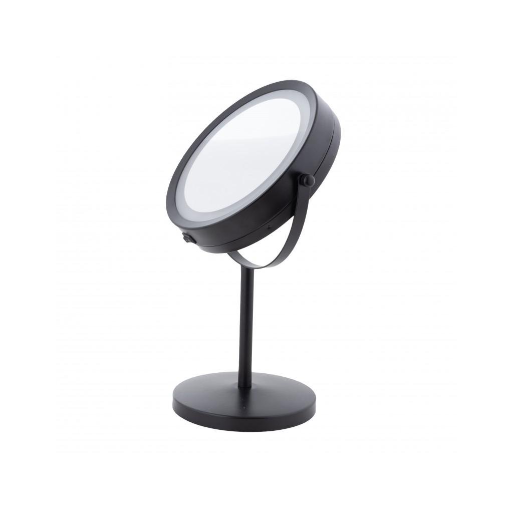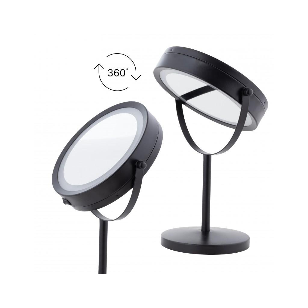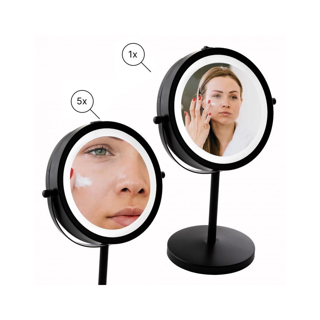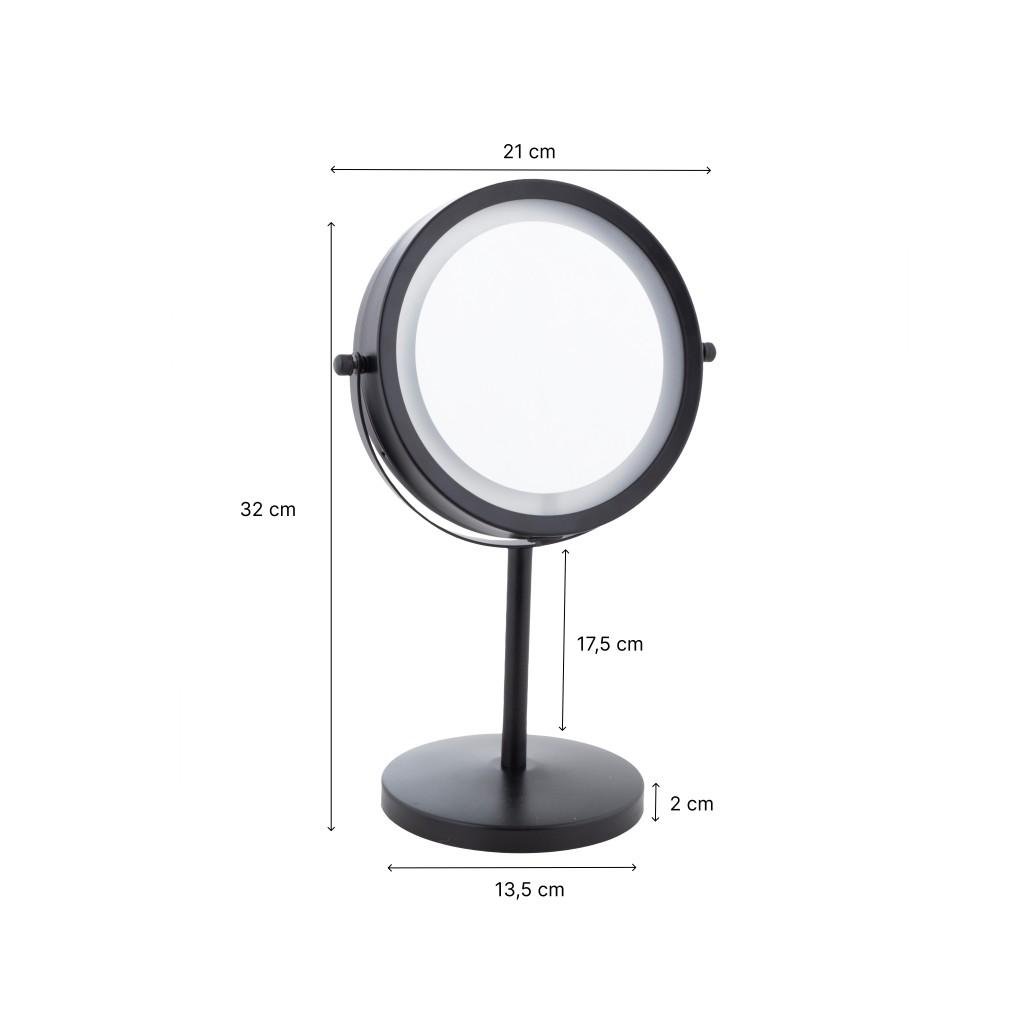 Szabadon álló, kerek LED-es tükör, sminkeléshez, hajformázáshoz, borotválkozáshoz vagy lencsék felszereléséhez. Krómozott acélból készült, 360°-os dőlésszög-állítással, melynek köszönhetően könnyen az aktuális igényekhez igazíthatjuk elrendezését. Kétoldalas: az egyik oldalon valós kép, a másik oldalon nagyított kép (x5). A háttérvilágítást a fedélen található ON/OFF kapcsoló aktiválja. Nemcsak a tetszetős megjelenés, hanem a praktikum is jellemzi, éppen ezért érdekes és hasznos kiegészítője lesz, amely változatossá teszi fürdőszobáját vagy fésülködőasztalát.