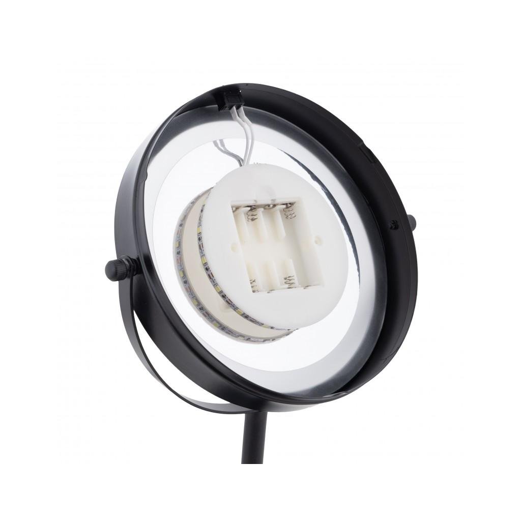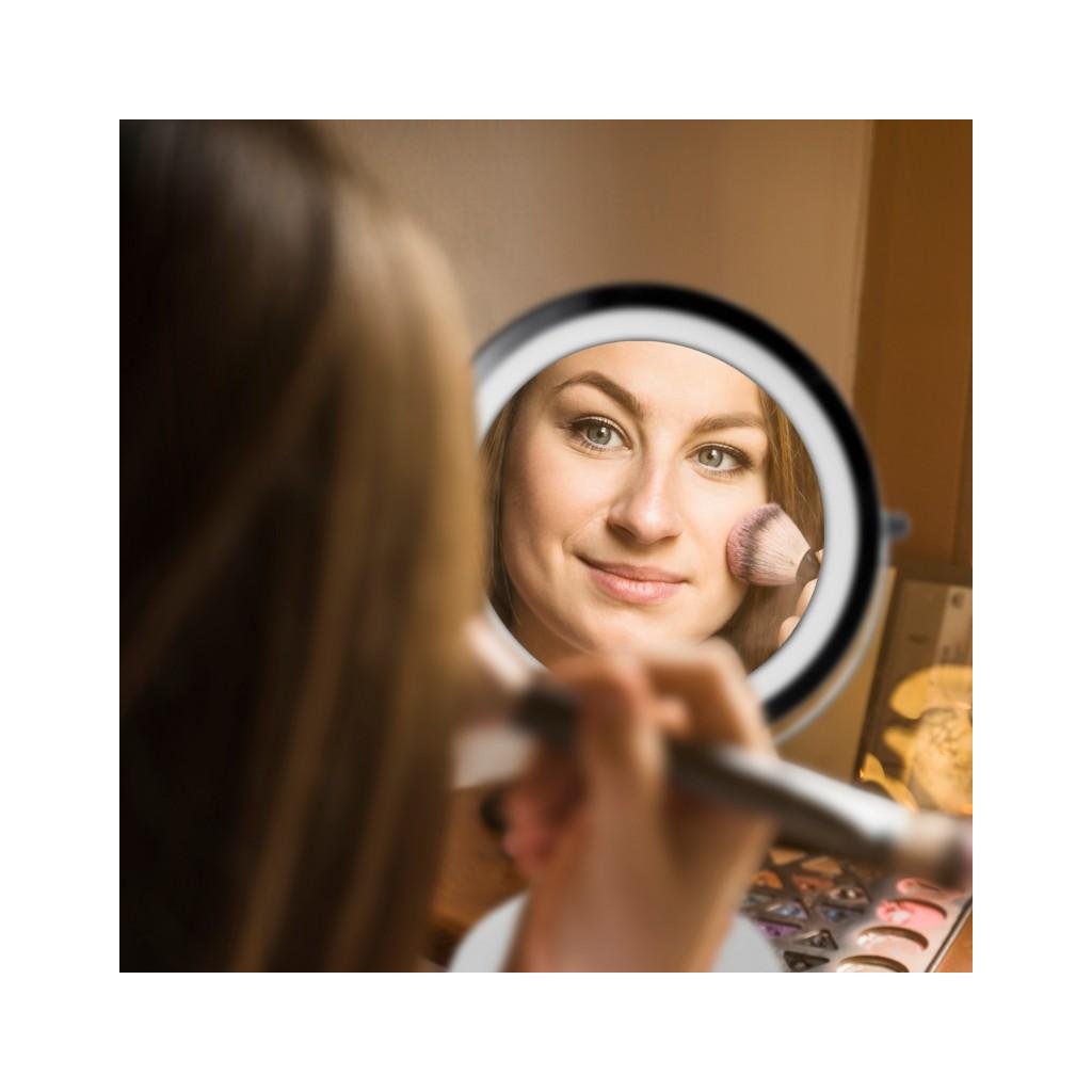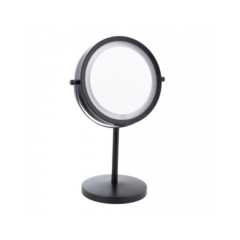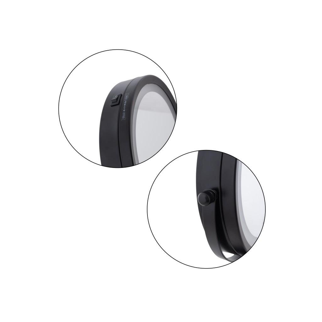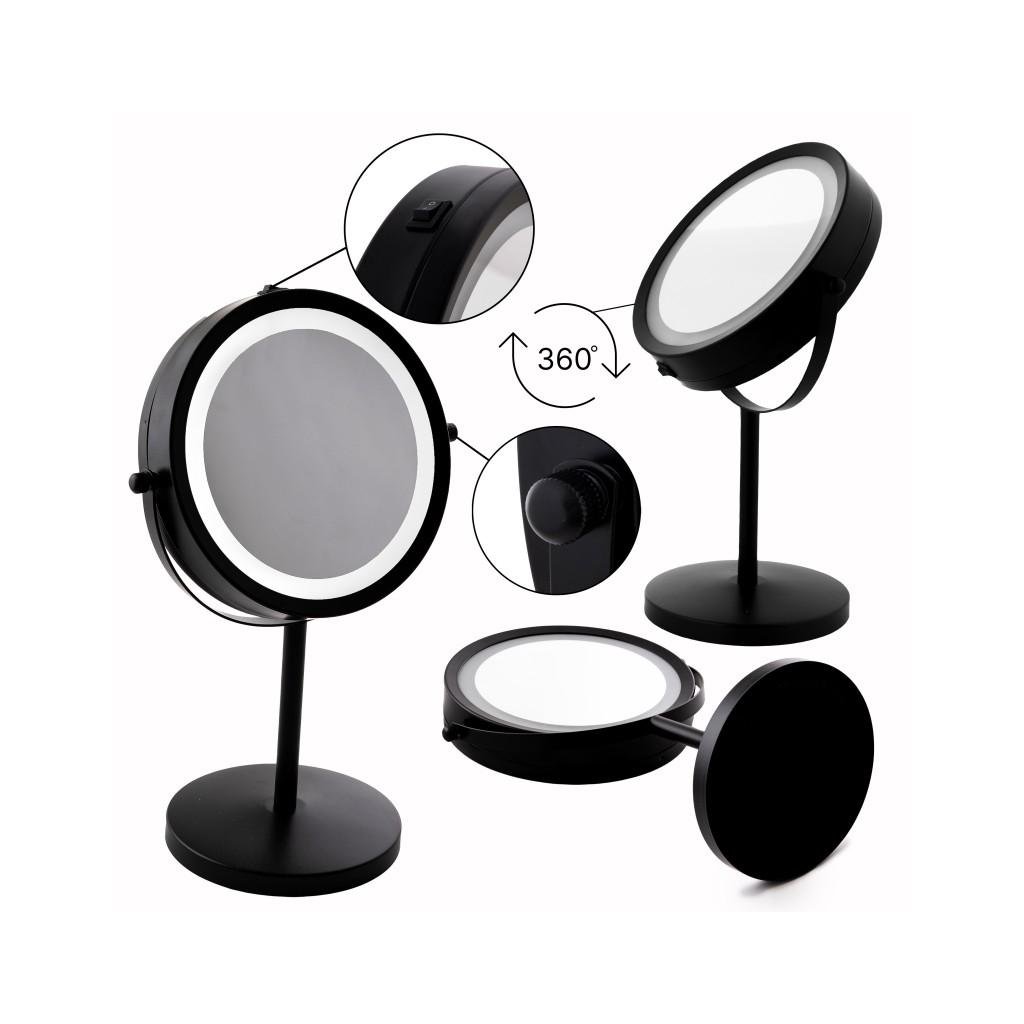 Szabadon álló, kerek LED-es tükör, sminkeléshez, hajformázáshoz, borotválkozáshoz vagy lencsék felszereléséhez. Krómozott acélból készült, 360°-os dőlésszög-állítással, melynek köszönhetően könnyen az aktuális igényekhez igazíthatjuk elrendezését. Kétoldalas: az egyik oldalon valós kép, a másik oldalon nagyított kép (x5). A háttérvilágítást a fedélen található ON/OFF kapcsoló aktiválja. Nemcsak a tetszetős megjelenés, hanem a praktikum is jellemzi, éppen ezért érdekes és hasznos kiegészítője lesz, amely változatossá teszi fürdőszobáját vagy fésülködőasztalát.