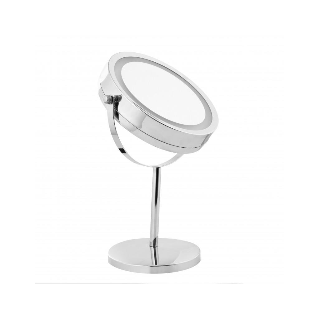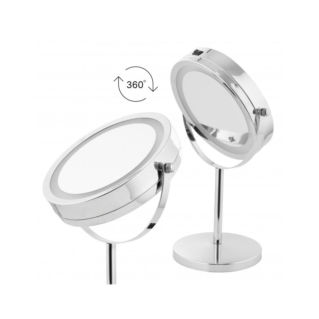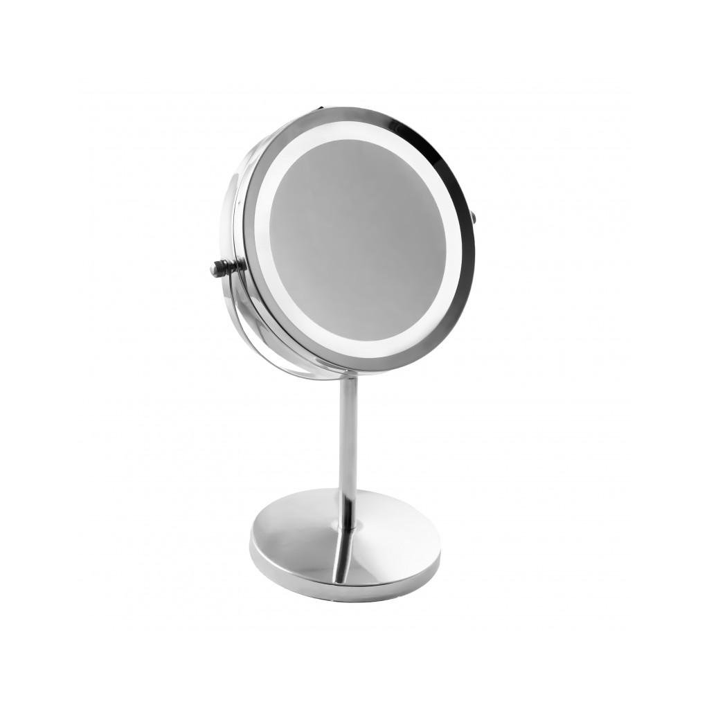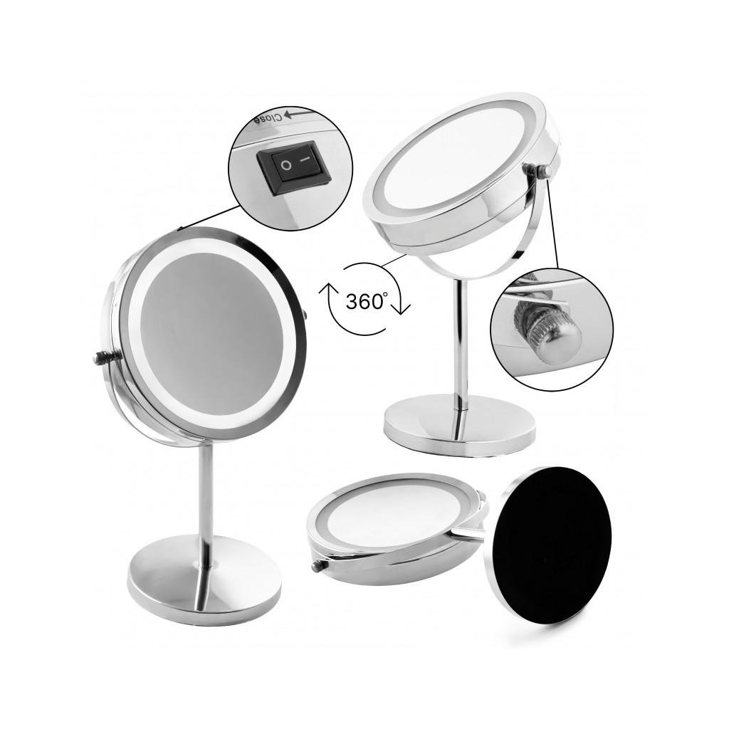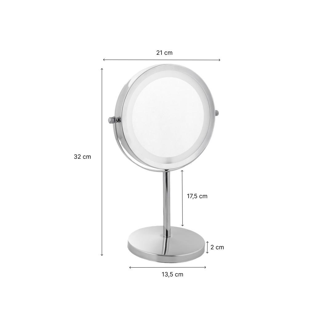 Szabadon álló, kerek LED-es tükör, sminkeléshez, hajformázáshoz, borotválkozáshoz vagy lencsék felszereléséhez. Krómozott acélból készült, 360°-os dőlésszög-állítással, melynek köszönhetően könnyen az aktuális igényekhez igazíthatjuk elrendezését. Kétoldalas: az egyik oldalon valós kép, a másik oldalon nagyított kép (x5). A háttérvilágítást a fedélen található ON/OFF kapcsoló aktiválja. Nemcsak a tetszetős megjelenés, hanem a praktikum is jellemzi, éppen ezért érdekes és hasznos kiegészítője lesz, amely változatossá teszi fürdőszobáját vagy fésülködőasztalát.