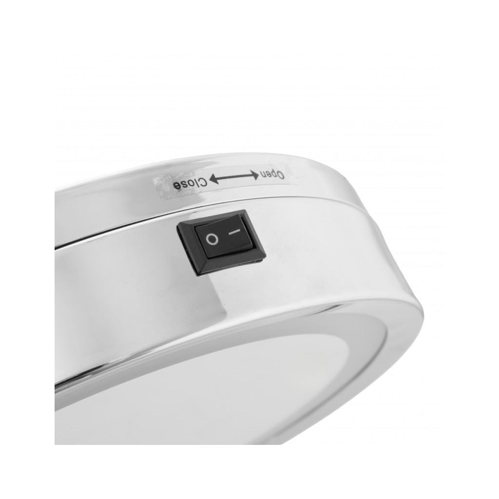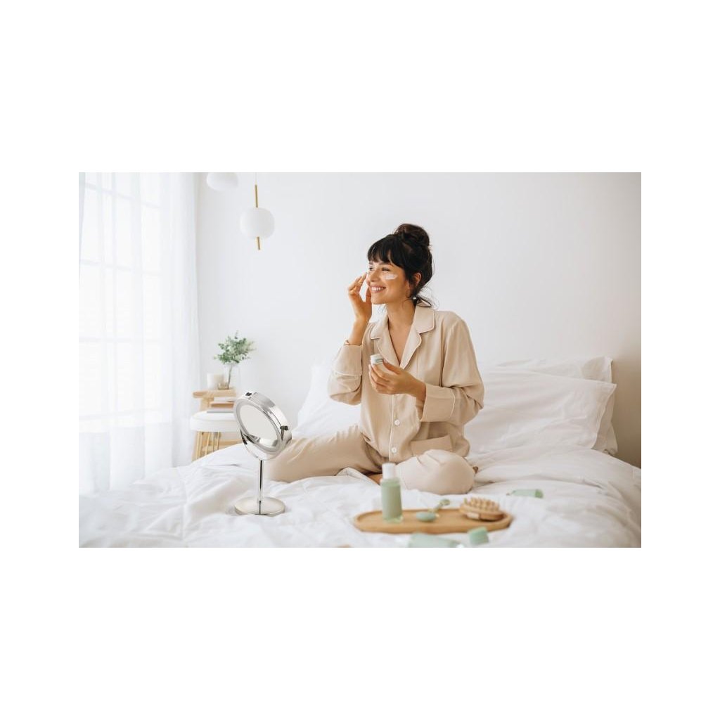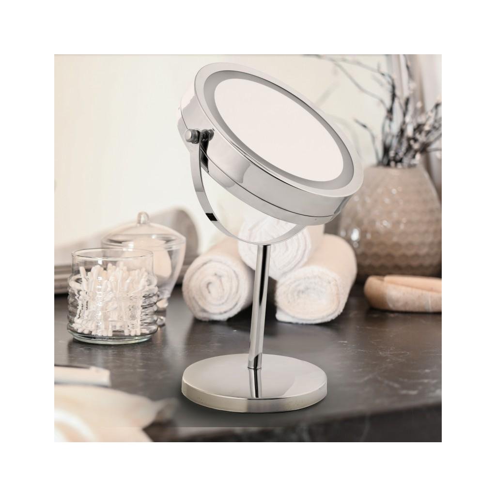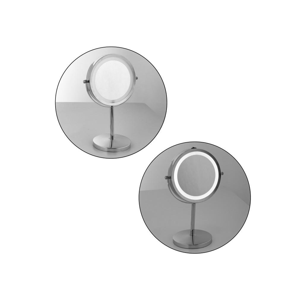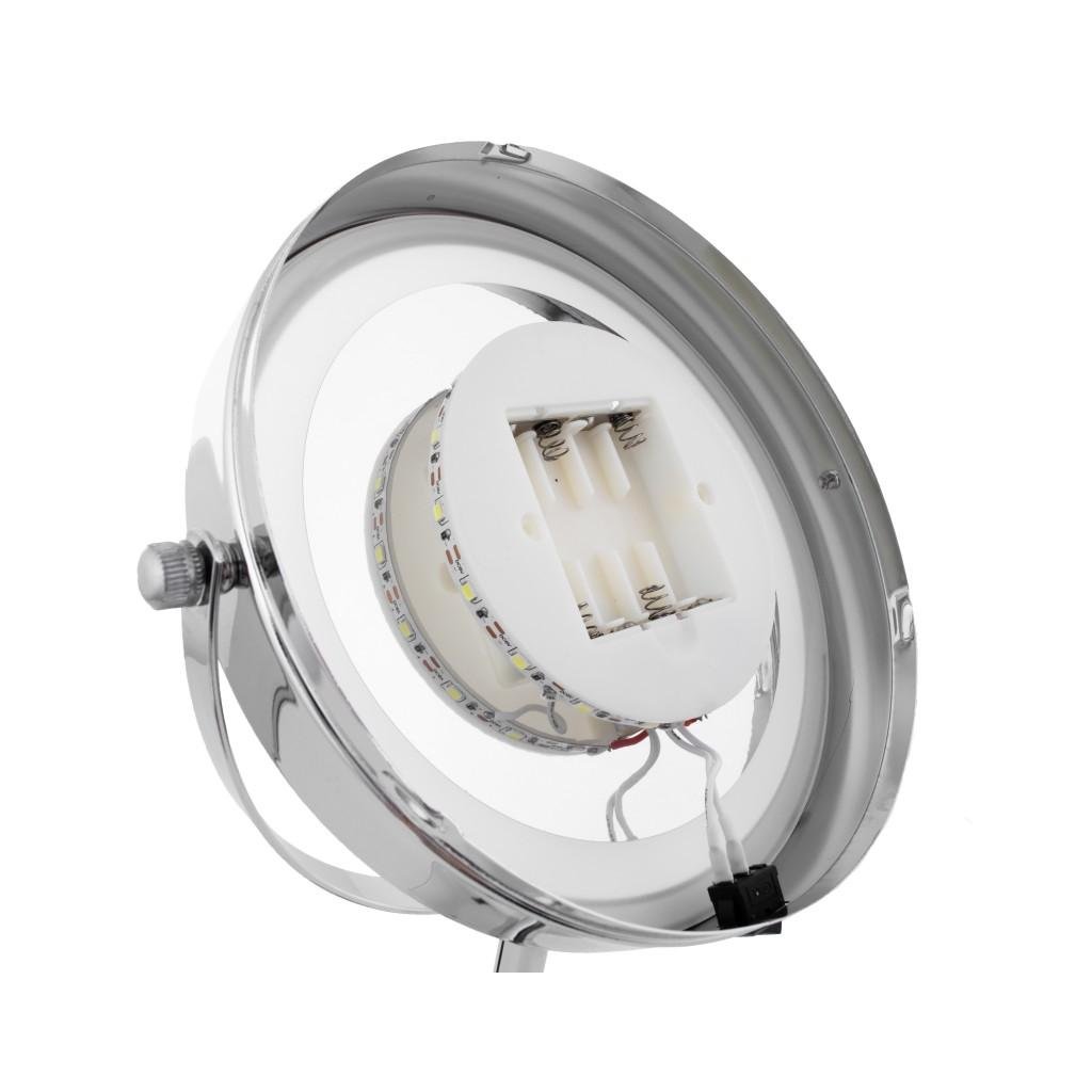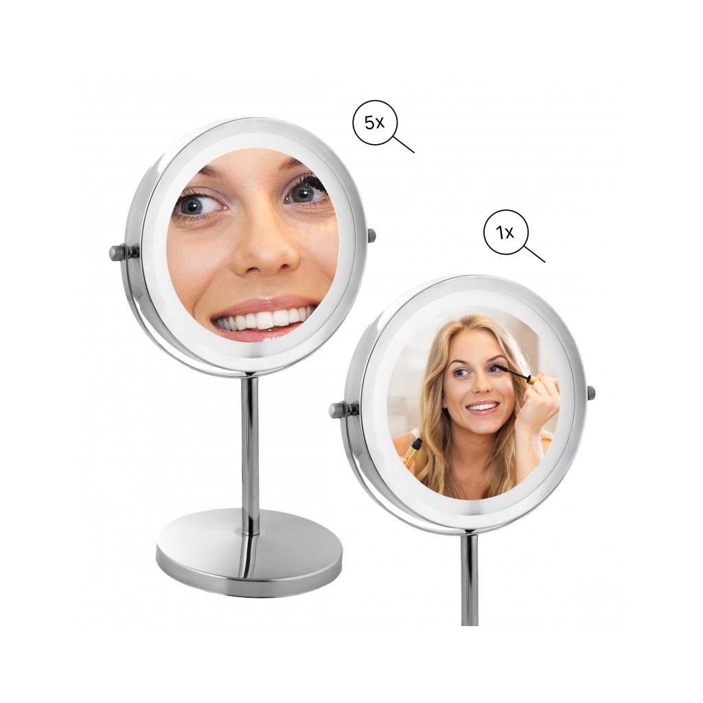 Szabadon álló, kerek LED-es tükör, sminkeléshez, hajformázáshoz, borotválkozáshoz vagy lencsék felszereléséhez. Krómozott acélból készült, 360°-os dőlésszög-állítással, melynek köszönhetően könnyen az aktuális igényekhez igazíthatjuk elrendezését. Kétoldalas: az egyik oldalon valós kép, a másik oldalon nagyított kép (x5). A háttérvilágítást a fedélen található ON/OFF kapcsoló aktiválja. Nemcsak a tetszetős megjelenés, hanem a praktikum is jellemzi, éppen ezért érdekes és hasznos kiegészítője lesz, amely változatossá teszi fürdőszobáját vagy fésülködőasztalát.