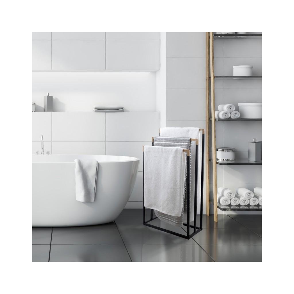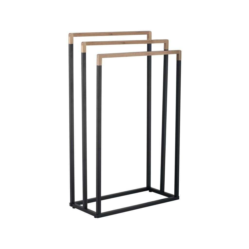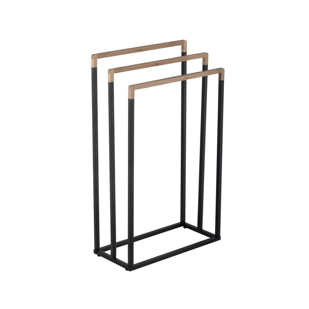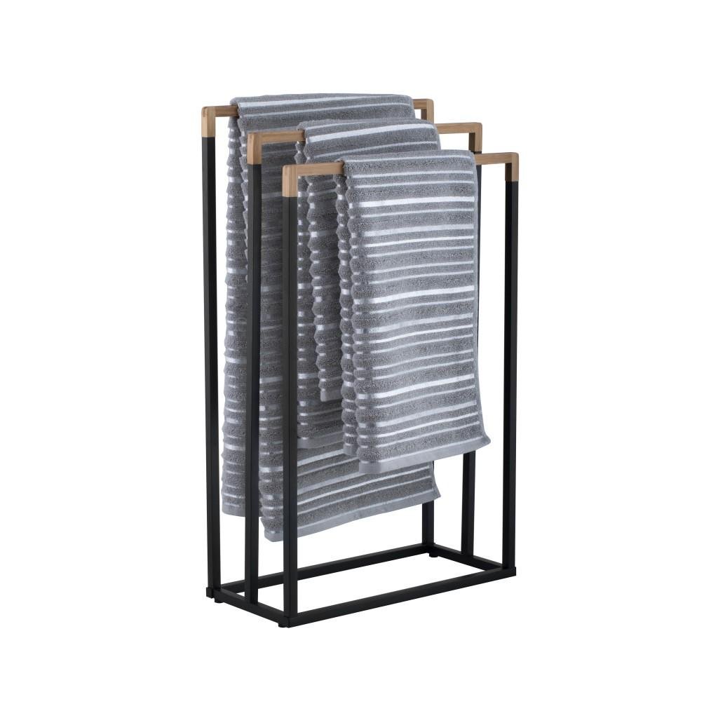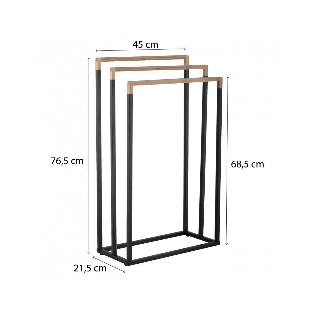 Szabadon álló háromkaros törölközőtartó a fürdőszobába. Fekete matt festékkel bevont acélból készült. A felső rész természetes nedvességálló bambuszfából készült. Az állvány három különböző magasságú karral rendelkezik, ami megkönnyíti a törölközők fel- és levételét. A vázszerkezet biztosítja a törölközők gyorsabb és alaposabb száradását. A könnyű, de stabil keret lehetővé teszi, hogy az állványt könnyedén a megfelelő helyre mozgassa. Ideális minden fürdőszobába.