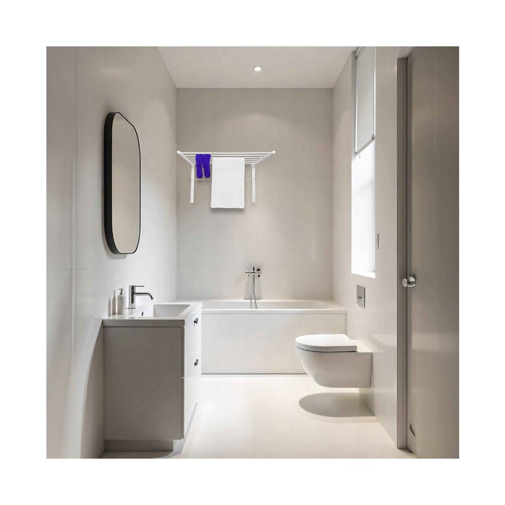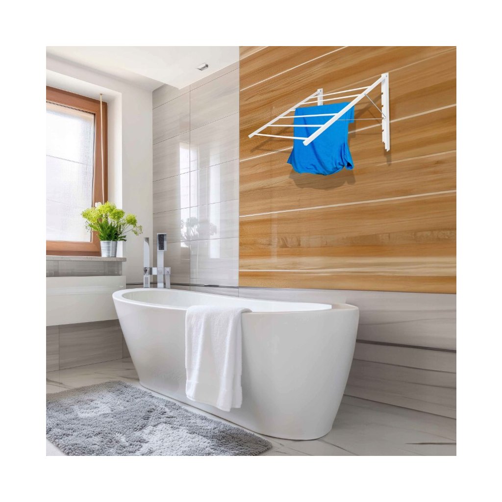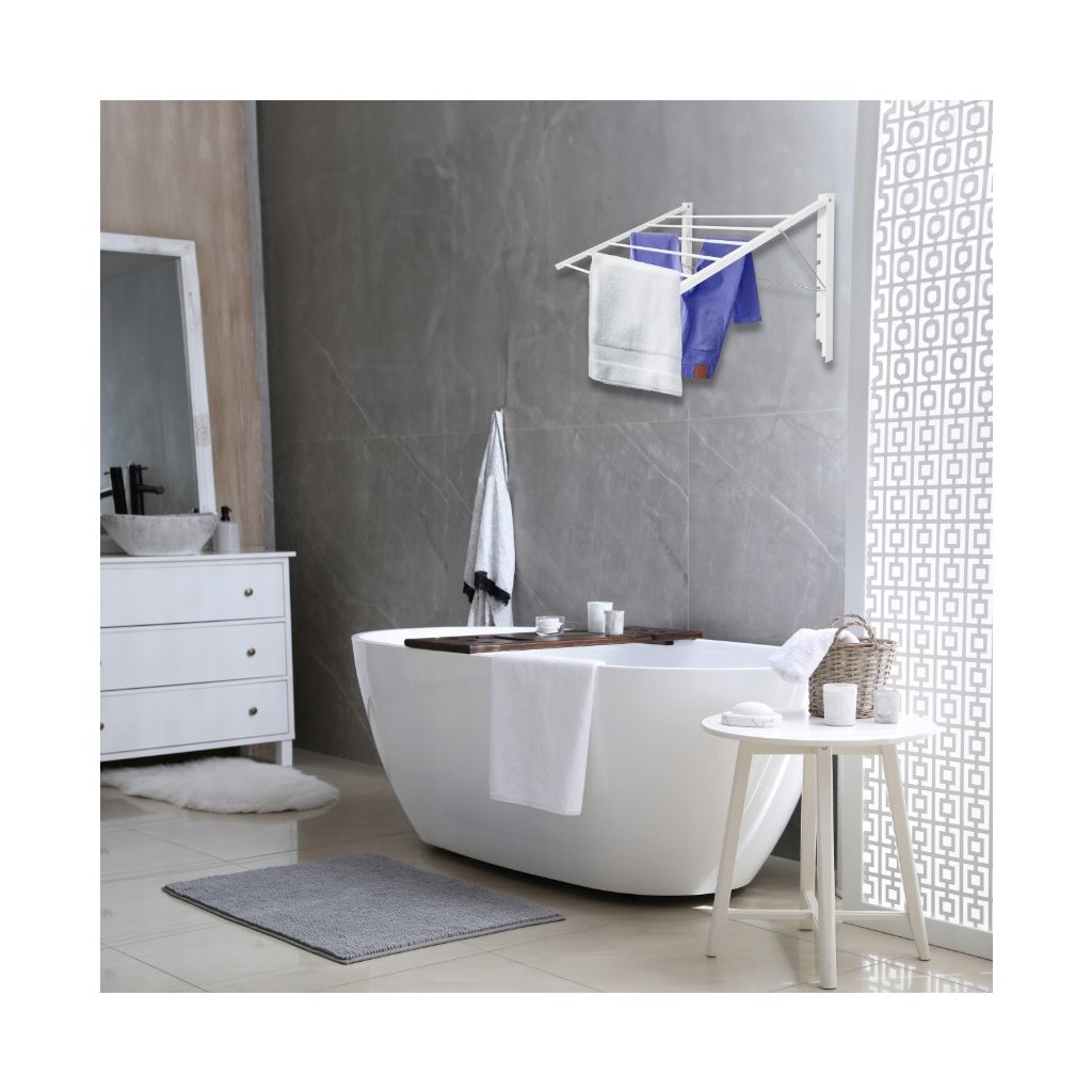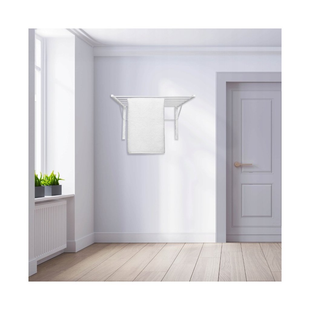 A szárítógép minimalista dizájnnal rendelkezik, amely harmonikusan illeszkedik bármely belső tér dekorációjába. Használaton kívül könnyen összehajtható, vagyis csak 5 cm-re emelkedik ki a falból, így nem foglal el értékes helyet. Teljesen kibontva eléri az 55 cm mélységet, így elegendő hely marad a felhasználónak a ruhanemű felakasztásához.