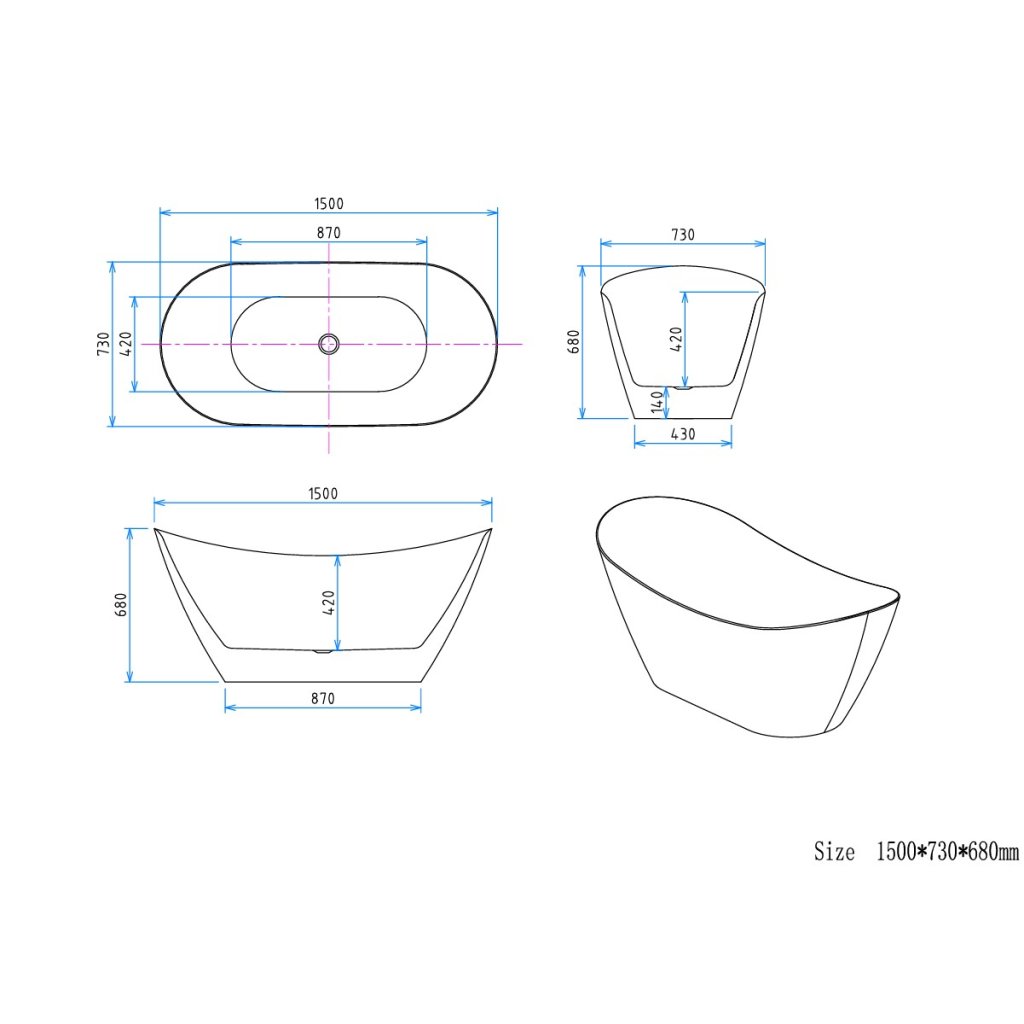 Erga Lina, szabadon álló kád 150x73 cm + lefolyódugó, fehér fényes felülettel, ERG-LINA-150073-WH-WH