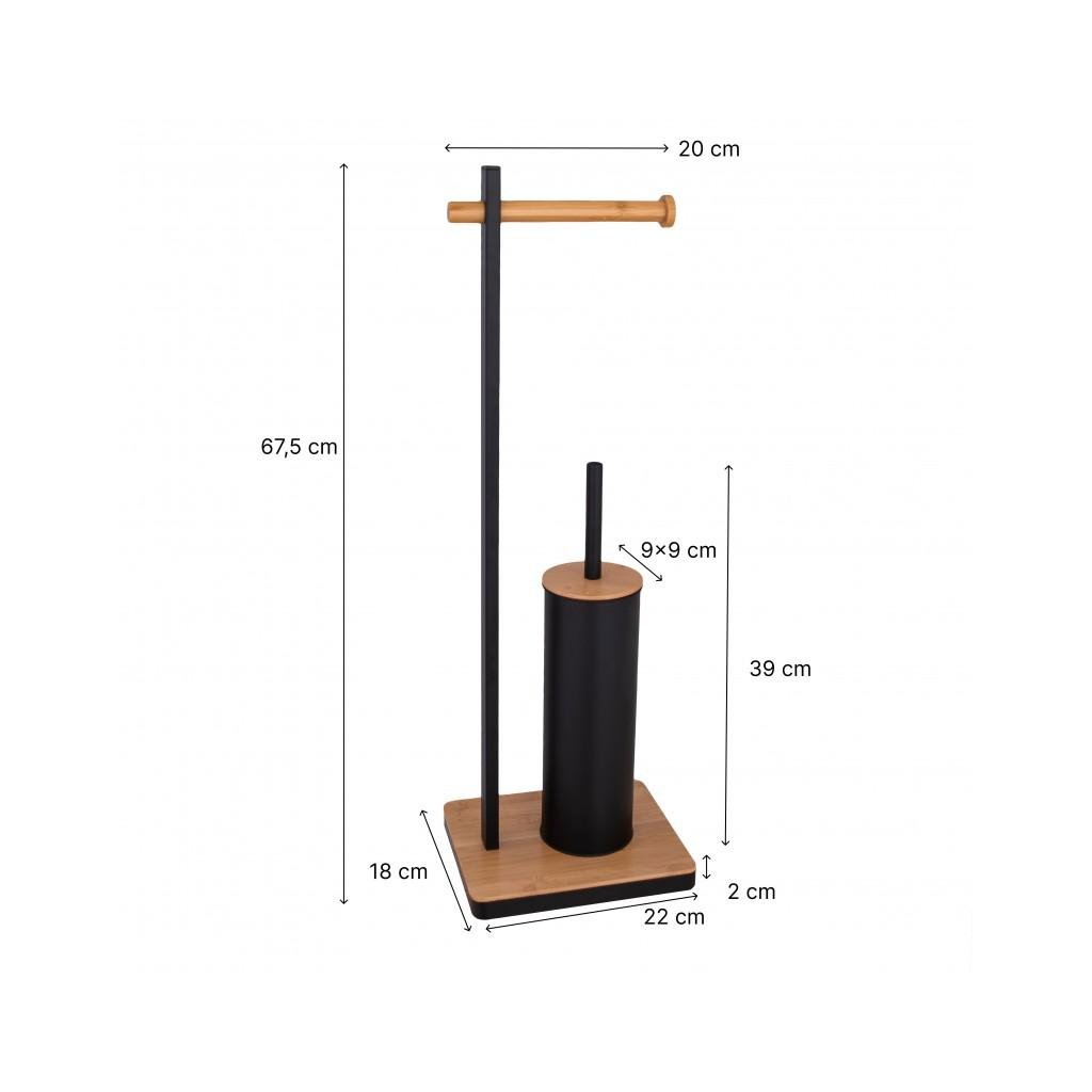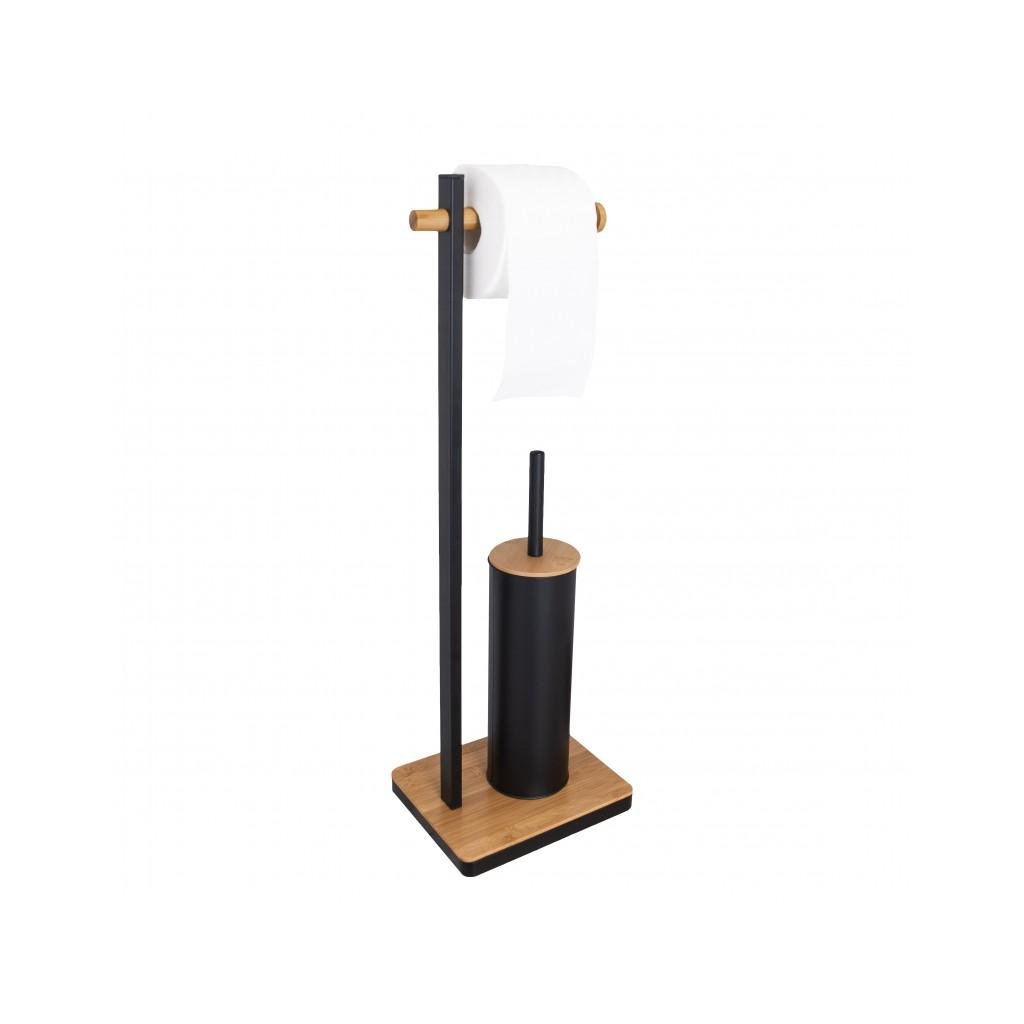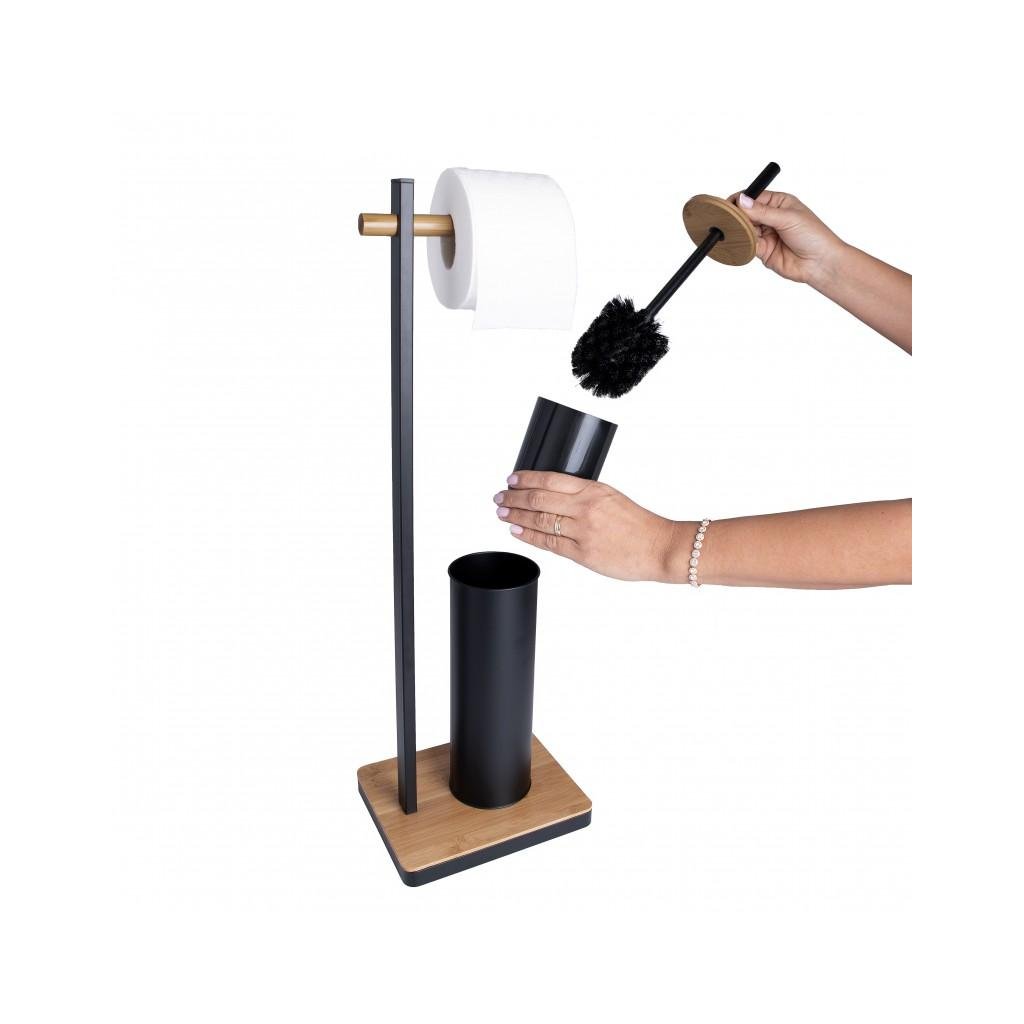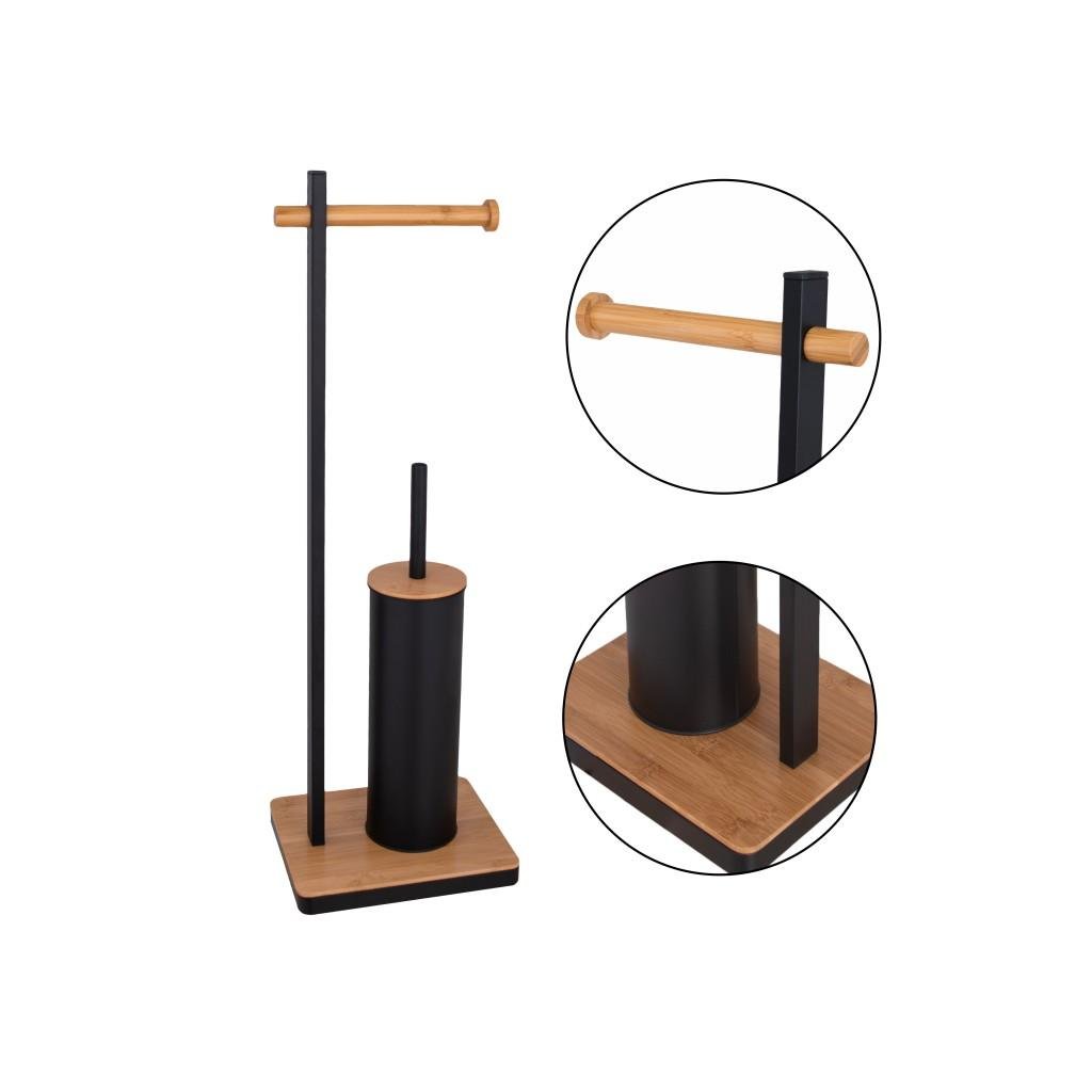 Szabadon álló WC-kefe beépített WC-papír tartóval. Az állvány kiváló minőségű, feketére festett acélból készült. Természetes bambuszfából készült állvány és papírtartó. A kefe védő műanyag tárolóval rendelkezik, amely véd a rozsdától és megkönnyíti a tisztítást. A széles, fekete acélvázzal bevont alap kiváló stabilitást biztosít.