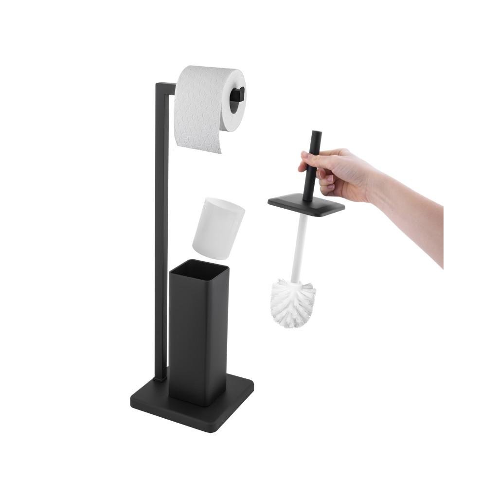 Szabadon álló WC-kefe beépített WC-papír tartóval. Az állvány kiváló minőségű, feketére festett acélból készült. A kefe védő műanyag tárolóval rendelkezik, amely véd a rozsdától és megkönnyíti a tisztítást. A csúszásgátló talp nagy stabilitást biztosít az állványnak.