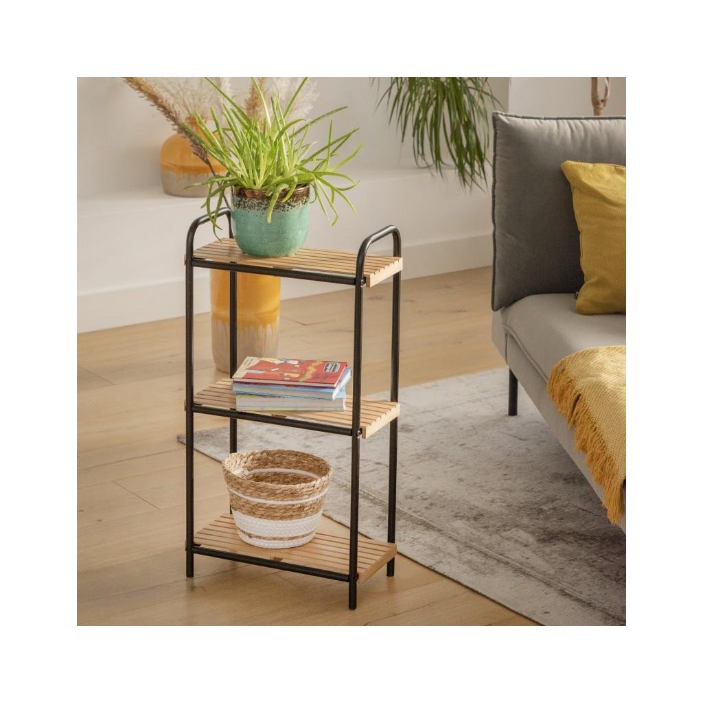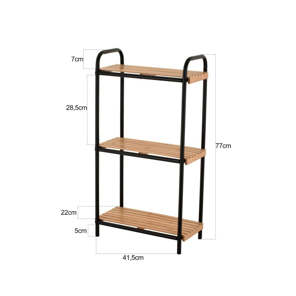 Fürdőszoba polc három hosszanti polccal. Kiváló minőségű fekete porszórt acélból készült. Természetes bambuszfából készült polcok. A könyvespolc ideális a fürdőszobába, de akár irodába, dolgozószobába vagy hálószobába is. A polcok közötti távolság 28,5 cm.