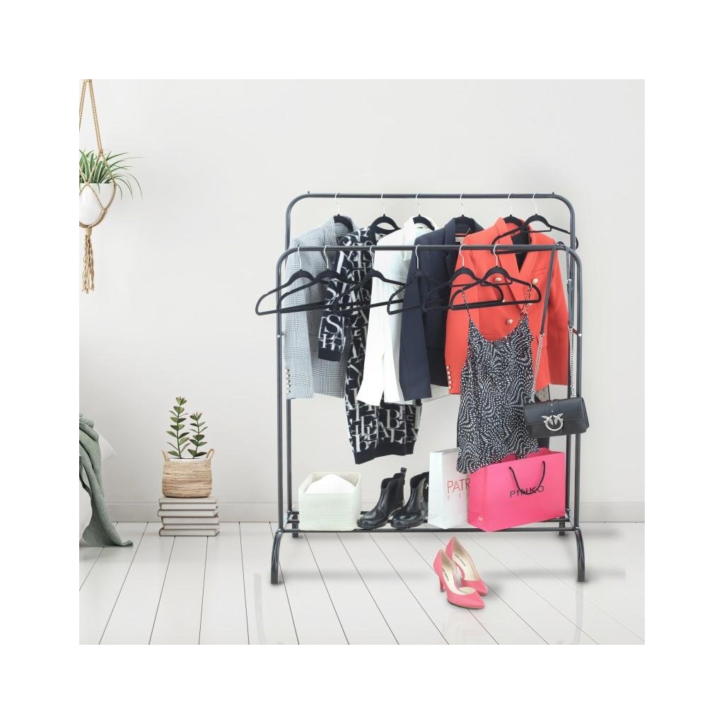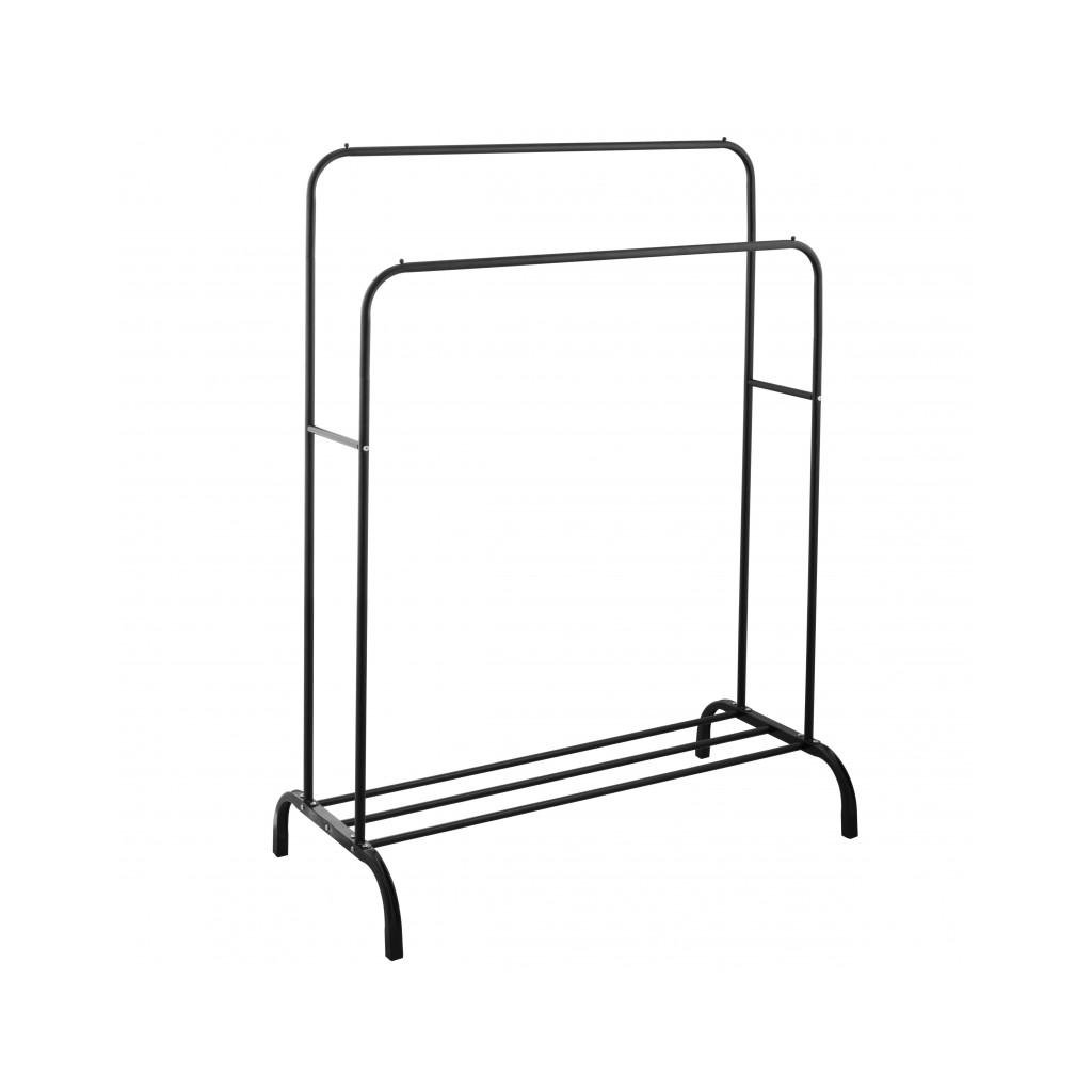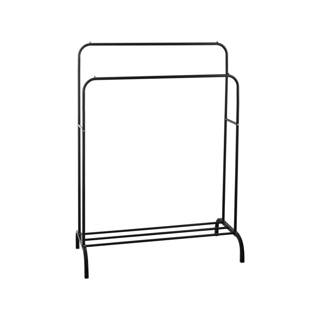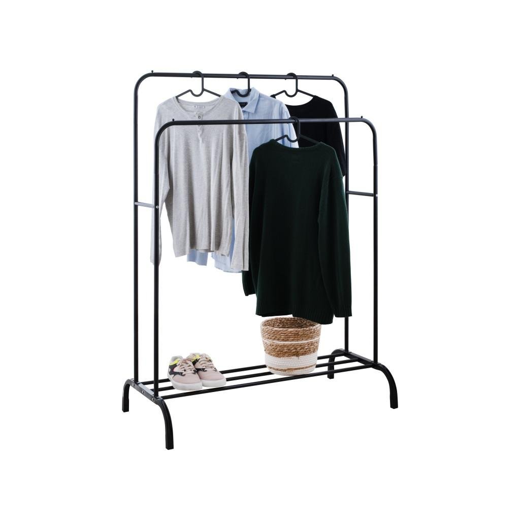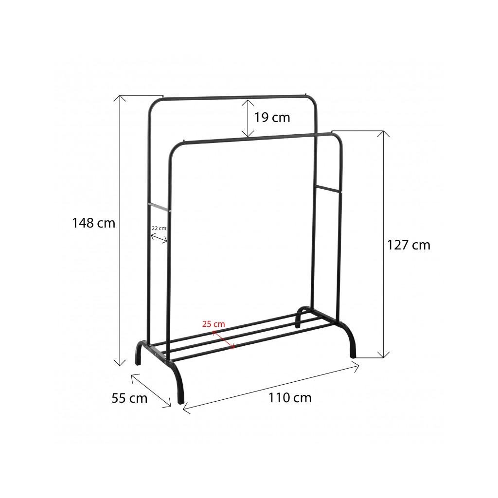 Szabadon álló dupla ruhaakasztó. Fekete porszórt acélból készült. Az állvány két különböző magasságú karral rendelkezik, amely lehetővé teszi a ruhák kényelmes felakasztását. Az alsó részben egy fém polc található cipők vagy egyéb kiegészítők számára. A kényelmes konstrukció lehetővé teszi az akasztó könnyű mozgatását és így biztosítja a stabilitását. Az akasztó ideális folyosóra, öltözőbe vagy hálószobába.
