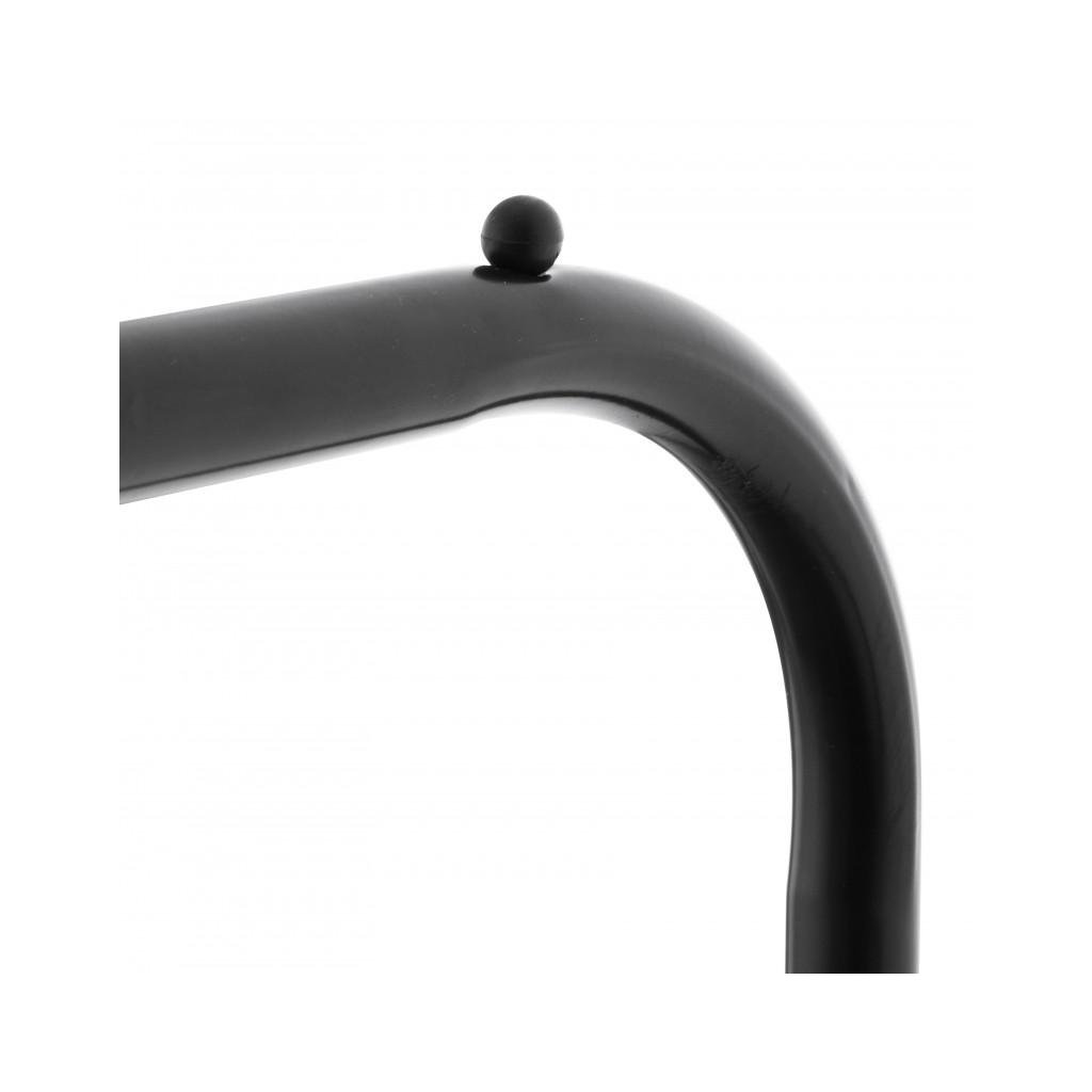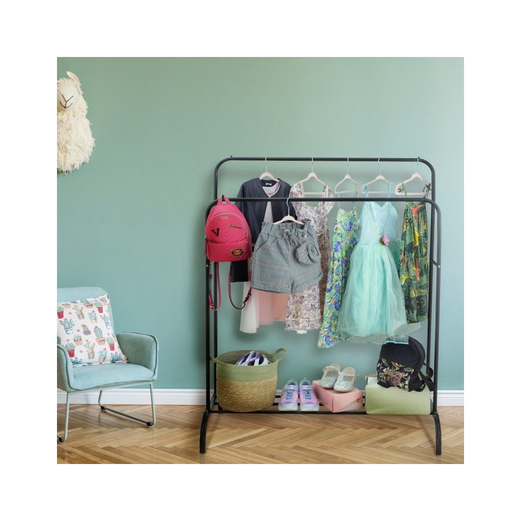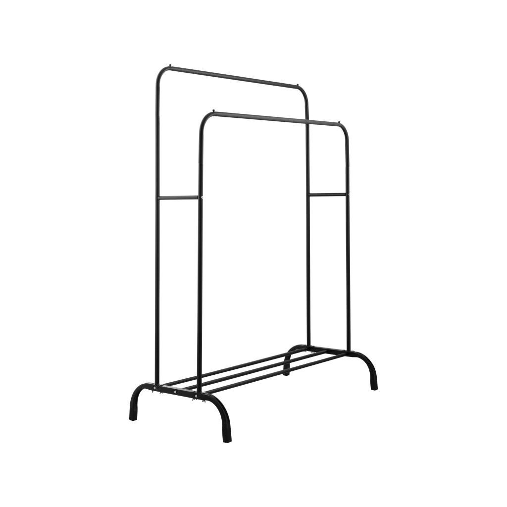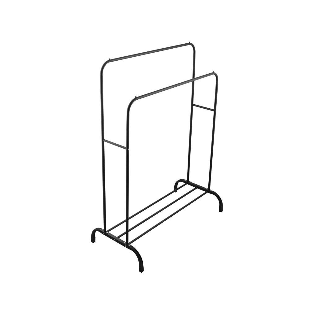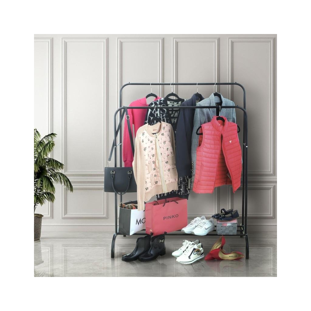 Szabadon álló dupla ruhaakasztó. Fekete porszórt acélból készült. Az állvány két különböző magasságú karral rendelkezik, amely lehetővé teszi a ruhák kényelmes felakasztását. Az alsó részben egy fém polc található cipők vagy egyéb kiegészítők számára. A kényelmes konstrukció lehetővé teszi az akasztó könnyű mozgatását és így biztosítja a stabilitását. Az akasztó ideális folyosóra, öltözőbe vagy hálószobába.